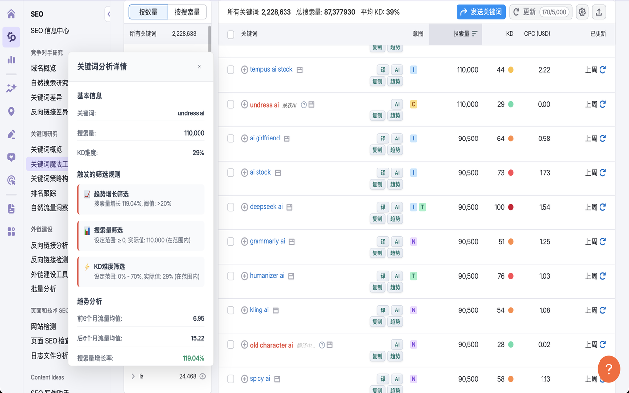 Semrush Helper是一款Chrome插件,自动筛选搜索量暴增且前期流量小的合规新词,并提供自动翻译和复制查询功能。