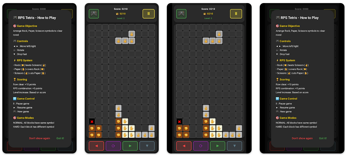 RPS Blocks是一款手机益智游戏,将俄罗斯方块机制与石头剪刀布规则相结合,提供清除行得分和RPS组合的额外积分,拥有普通和困难两种游戏模式。