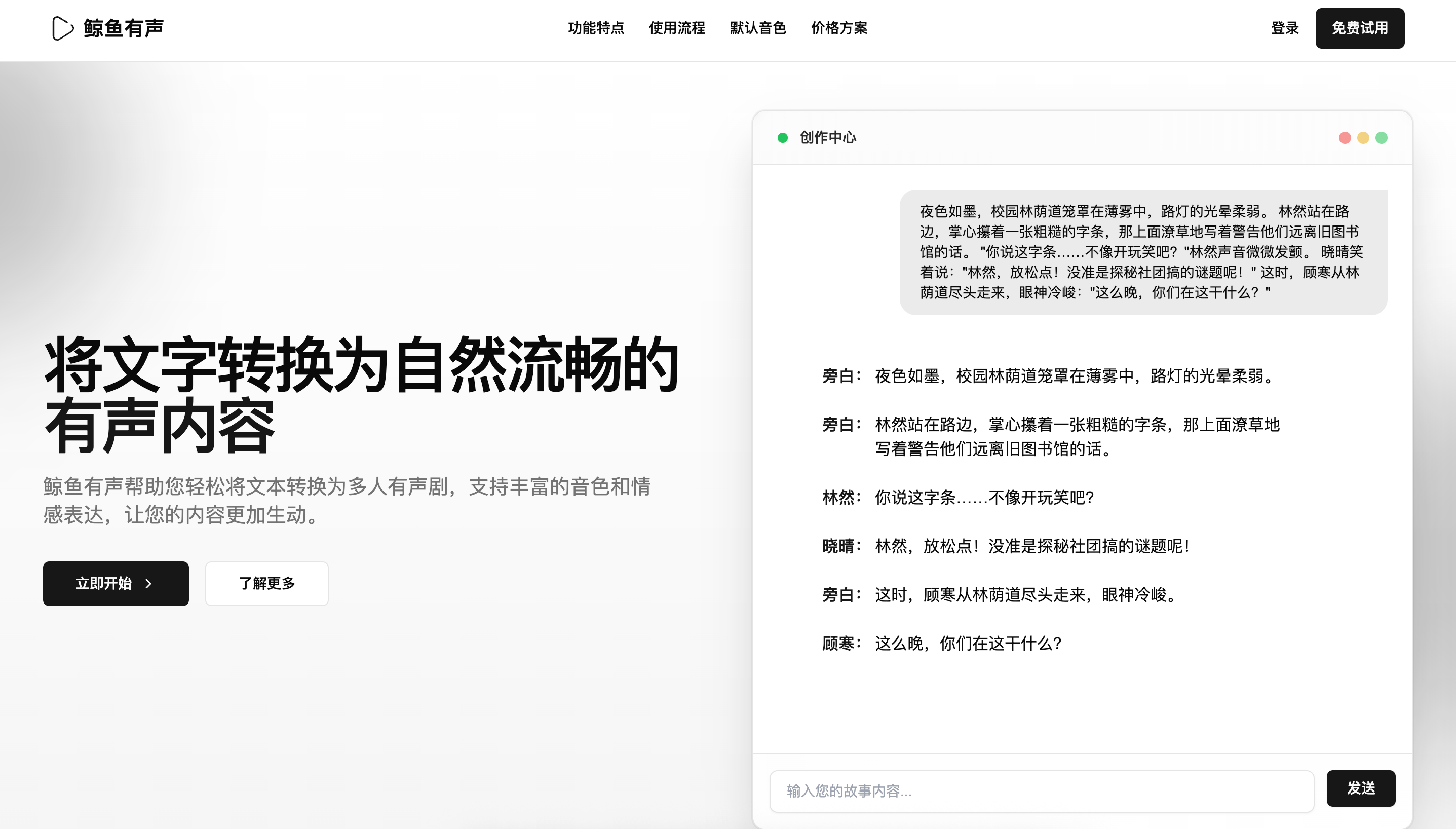 Whaleaudio是一款文本转多人有声剧的AI工具,能够识别文本中的不同角色、生成专业的台词脚本并根据角色特点生成专属音色。