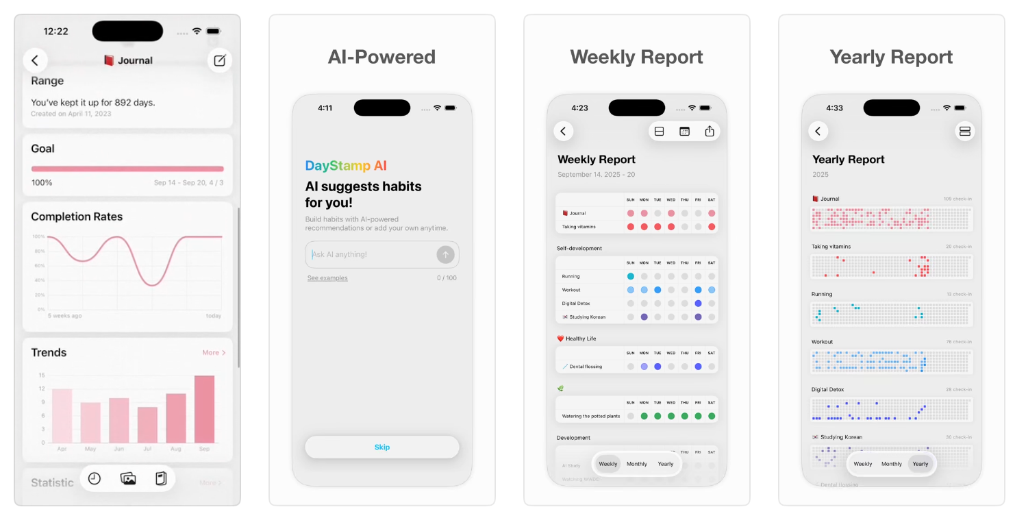Daystamp是一款轻量级、无压力的习惯养成应用,简洁直观的设计和积极的反馈,旨在鼓励用户建立习惯而不增加压力。