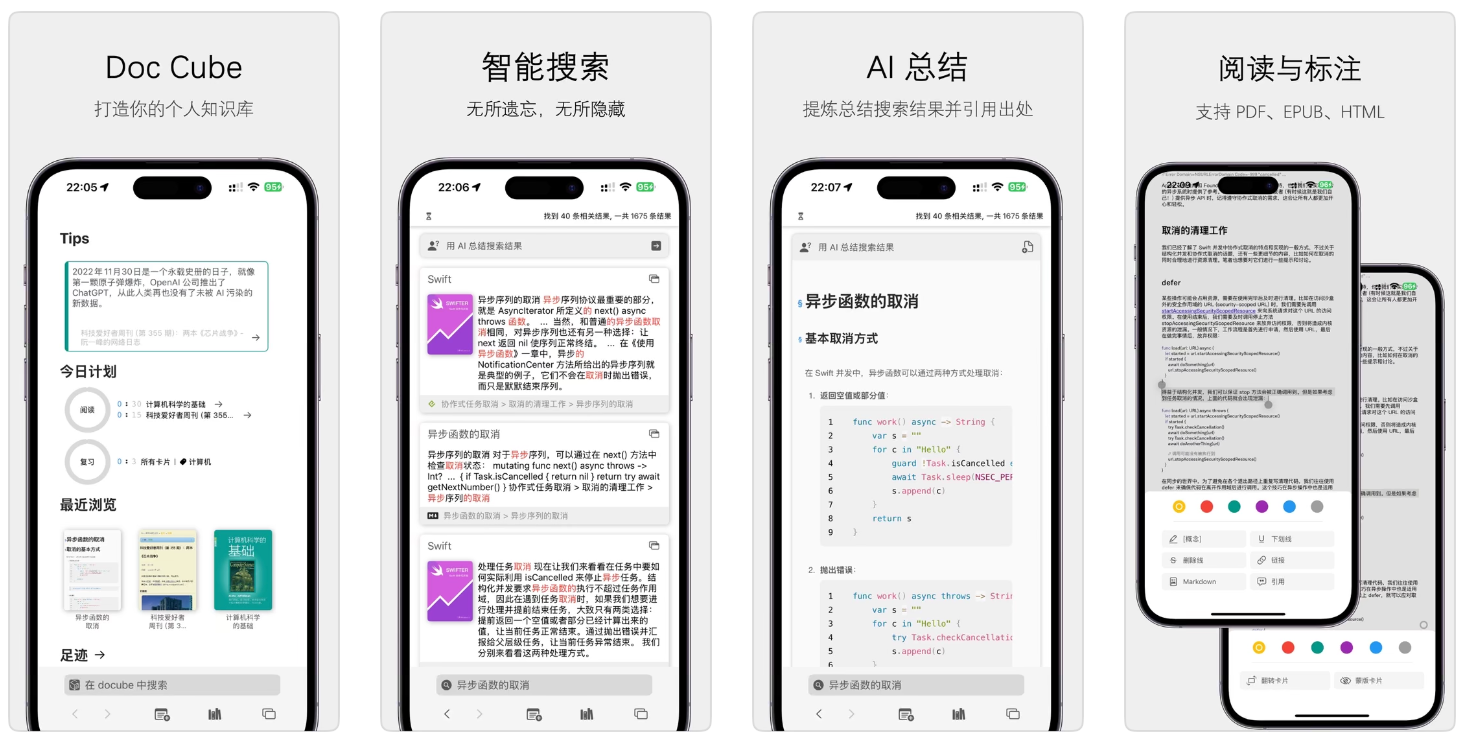 DoCube是一款用于打造个人知识库的文档浏览器,支持多种文档格式导入、标注、离线同步和独特的URL定位功能。