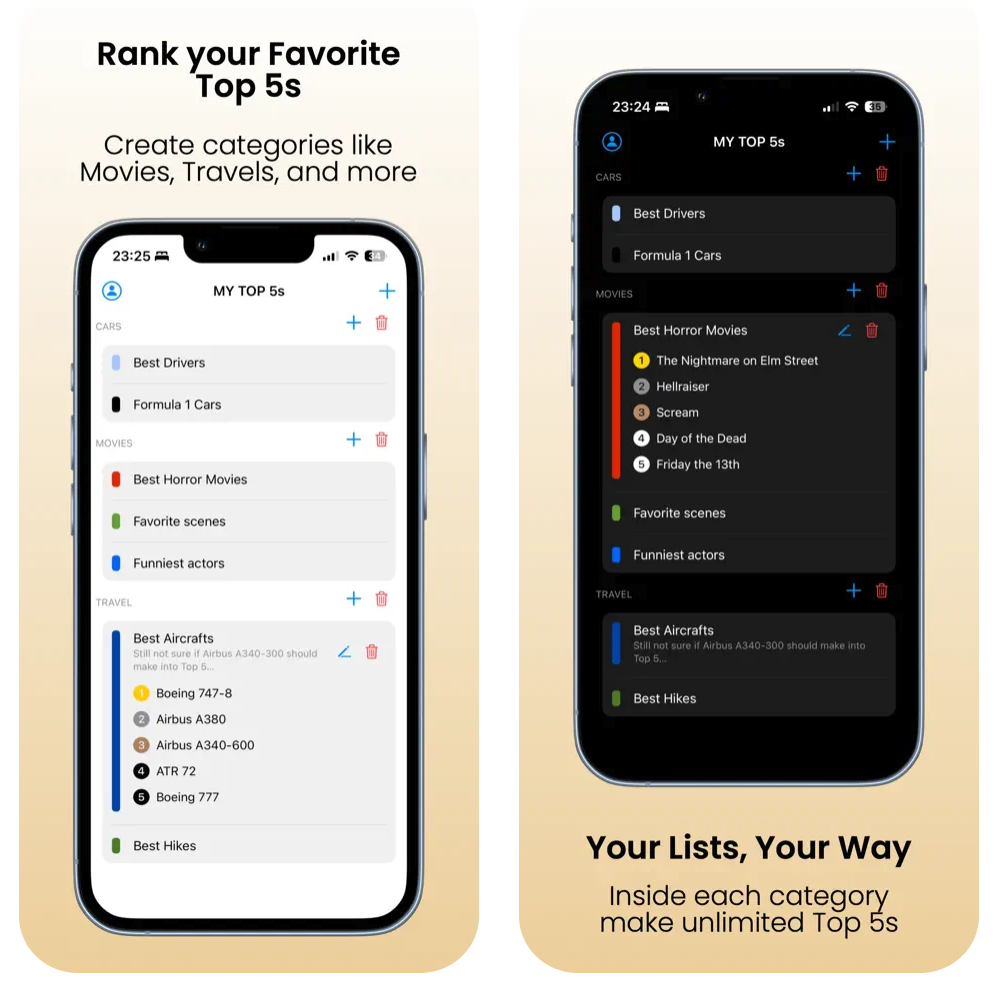 Fyv It!是一款iOS应用,帮助用户创建和组织个人喜好的Top 5列表,涵盖电影、旅行、歌曲、美食等内容。