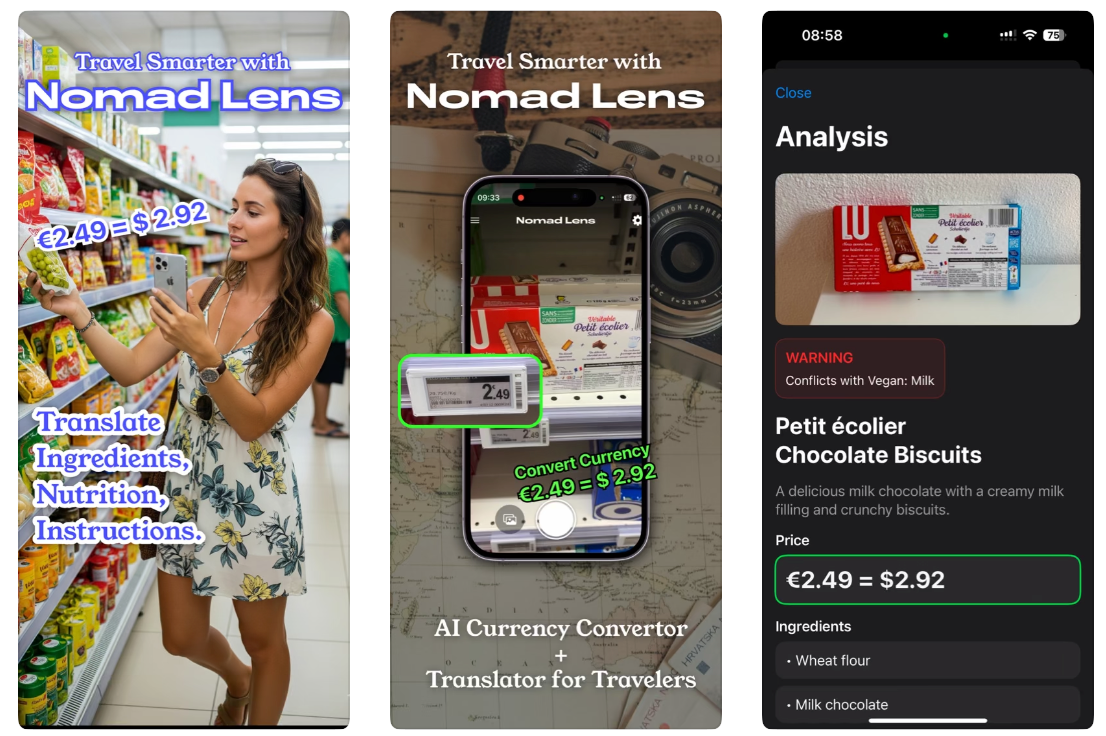 Nomad Lens是一款AI相机应用,通过扫描产品标签翻译成分和营养信息、检测价格并转换为当地货币,以及总结说明并警告过敏原和饮食限制。