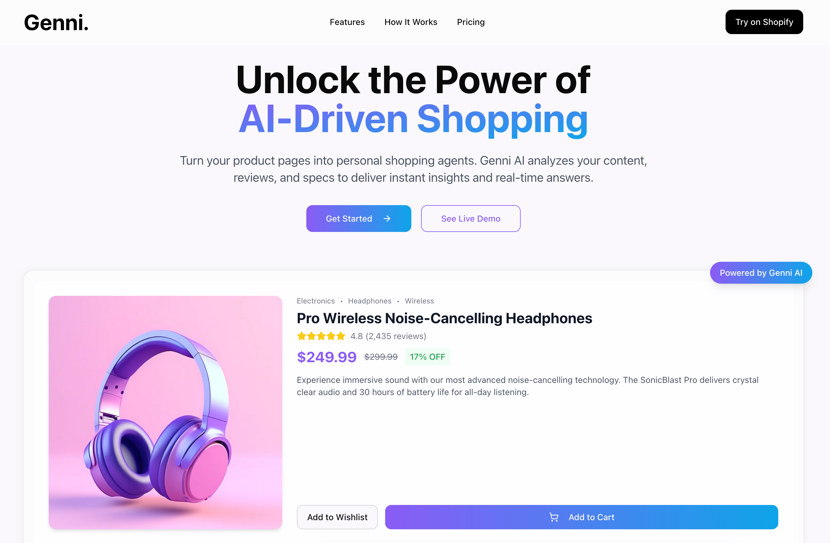 Genni是一款AI购物助手,能够展示商品的功能和评价摘要,并支持回答用户的产品相关问题。