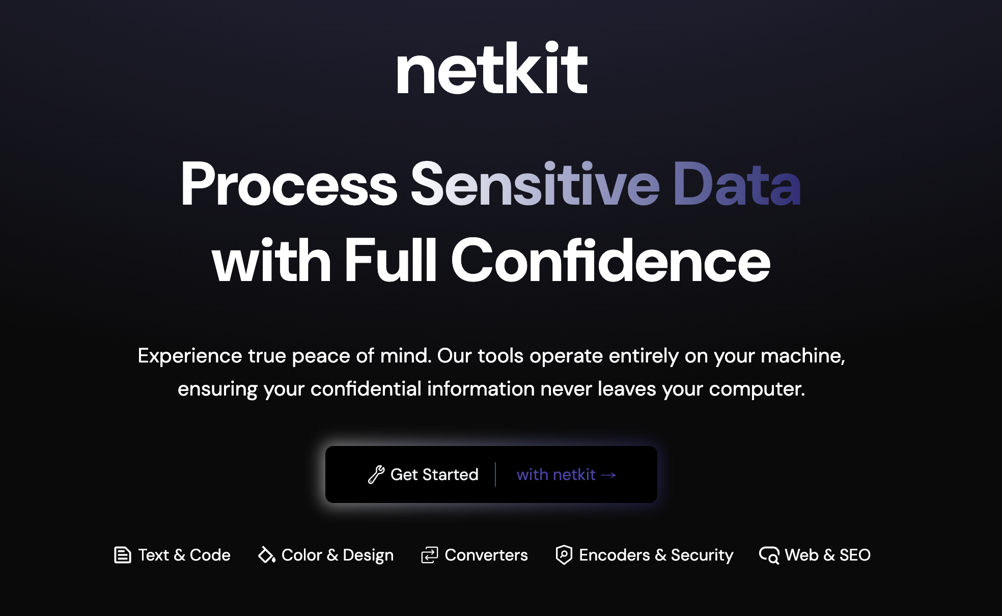 netkit是一款完全在浏览器中运行的开发者工具包,100%客户端处理,确保数据安全,提供30多种工具,涵盖文本处理、颜色设计、格式转换、编码安全和Web SEO等功能。