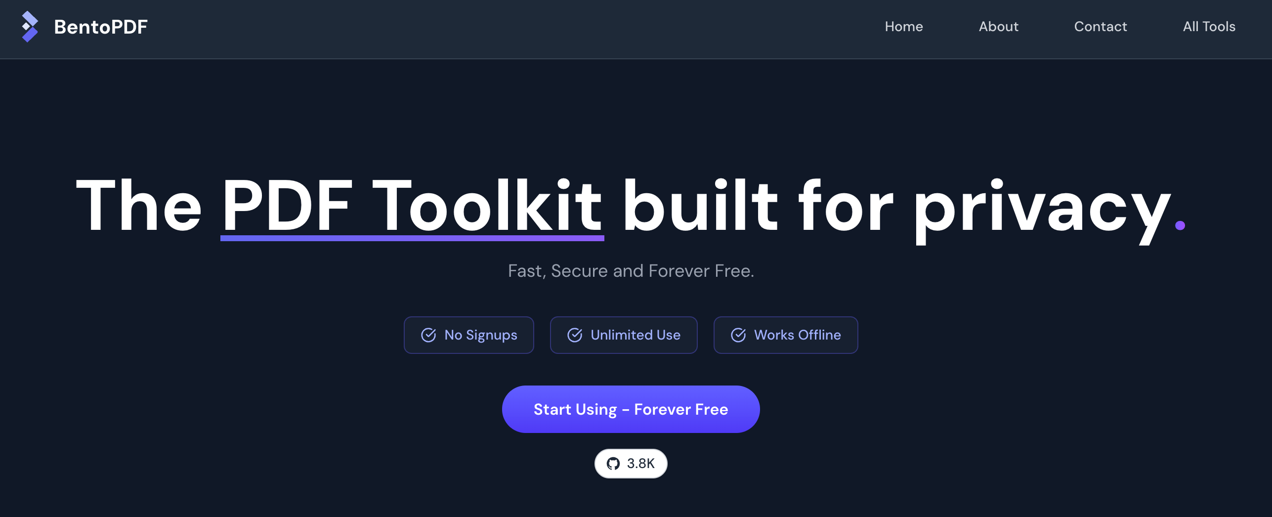 BentoPDF是一款注重隐私的PDF工具,完全在浏览器中本地运行,无需上传、注册或广告,提供合并、分割、压缩等50多种工具。