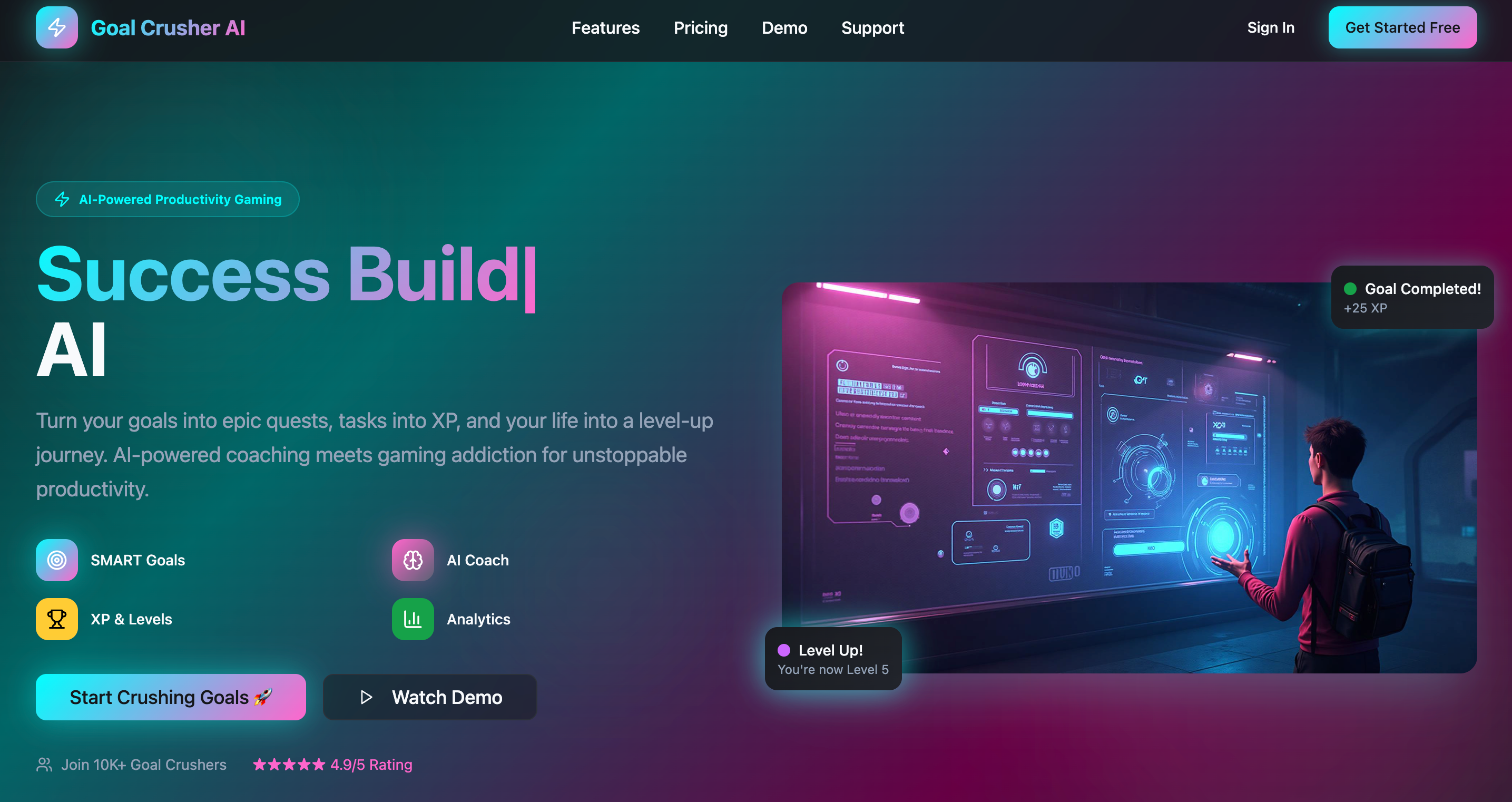 GoalCrusher是一款利用AI帮助用户设定和达成目标的应用,SMART目标创建向导、AI任务分解、智能自动排程和游戏化XP升级系统。