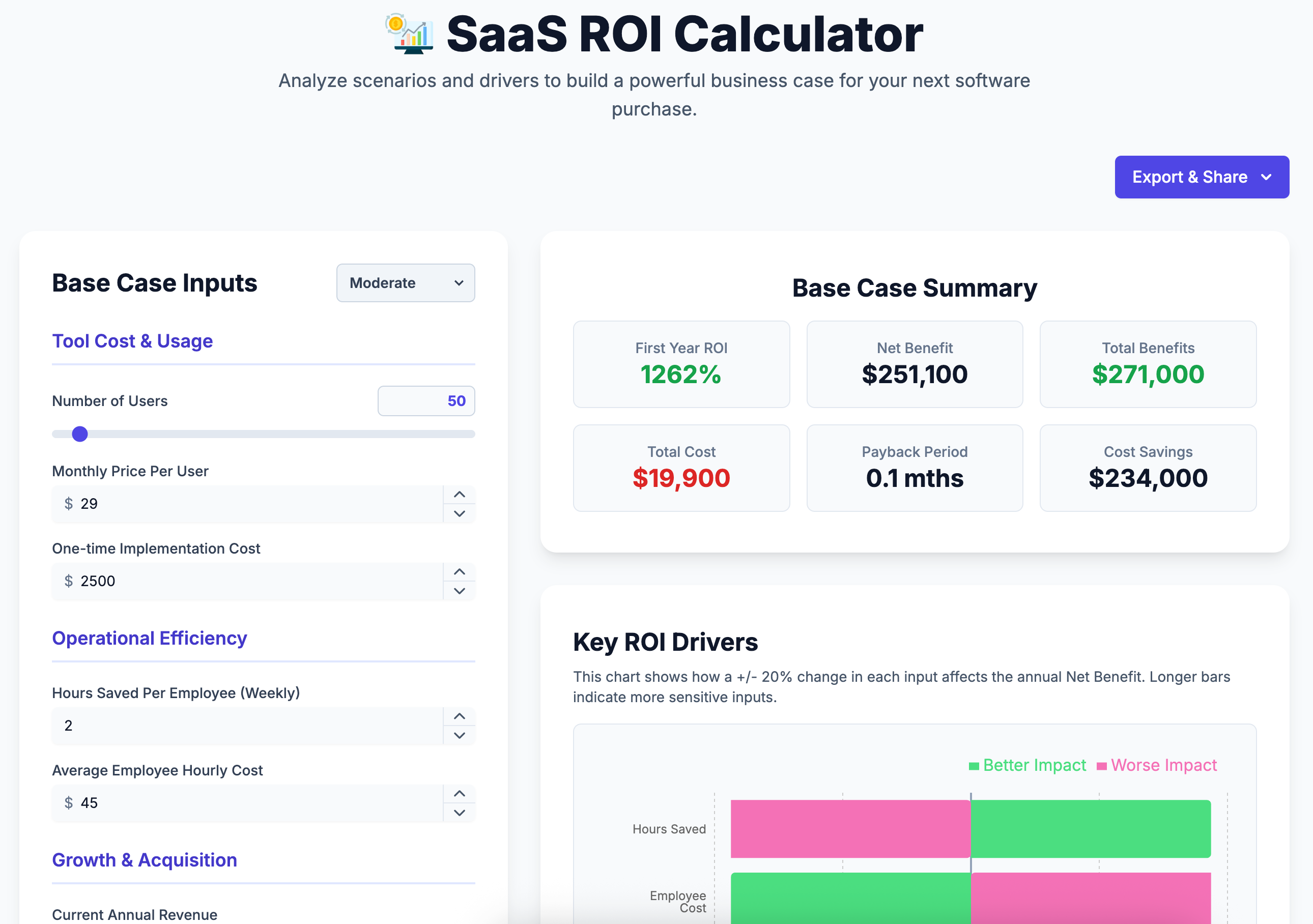 SaaS ROI Calculator是一款免费的投资回报率计算工具,帮助SaaS创始人和产品经理快速评估定价变化和获客支出的影响,提供即时的ROI预测和可下载报告。