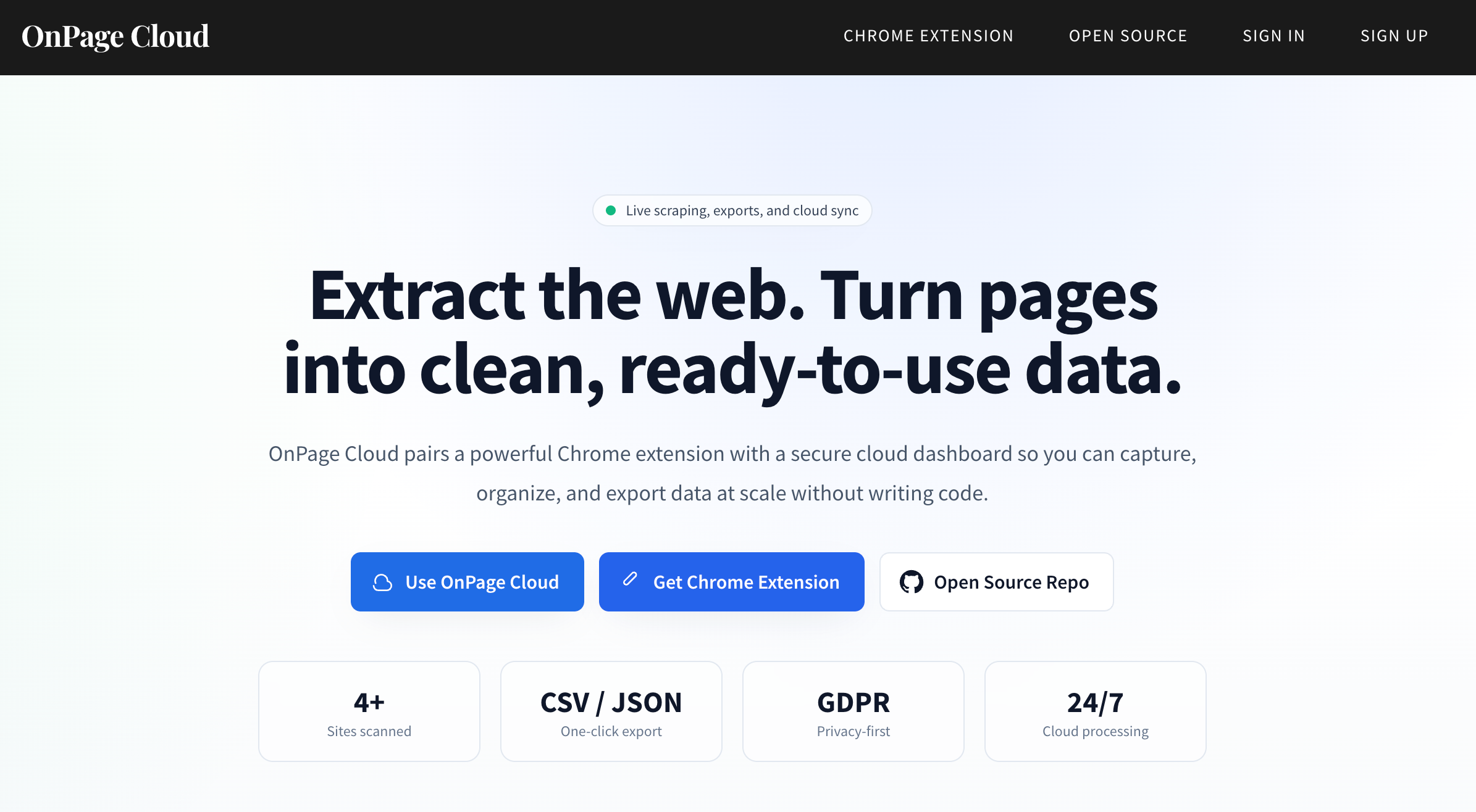 OnPage是一款开源Chrome扩展,提供可视化网页抓取功能,无需编码,支持自动滚动和导出CSV或JSON格式数据,注重隐私保护。