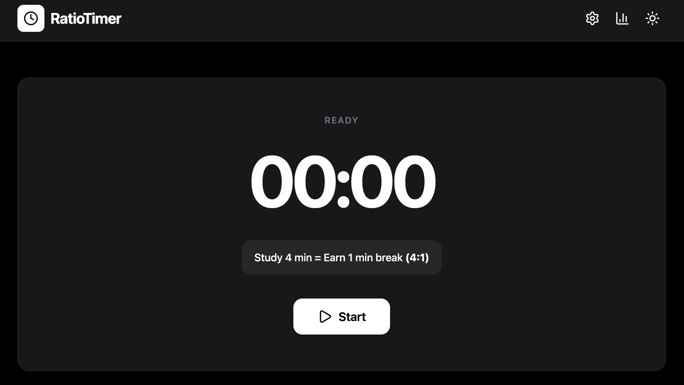 Ratiotimer是一款基于4:1工作休息比例的番茄工作法web应用,根据学习时间自动调整休息时长,并提供干净的用户界面和数据统计功能。