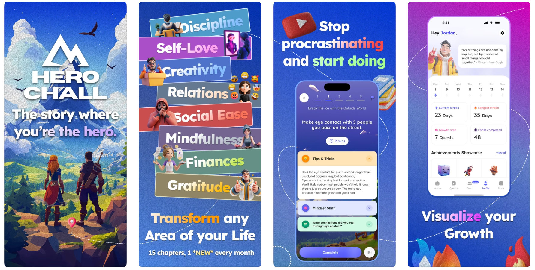 Herochall是一款游戏化的个人成长应用,通过每日短挑战(5-30分钟)帮助用户逐步走出舒适区,促进自我反思和成长。