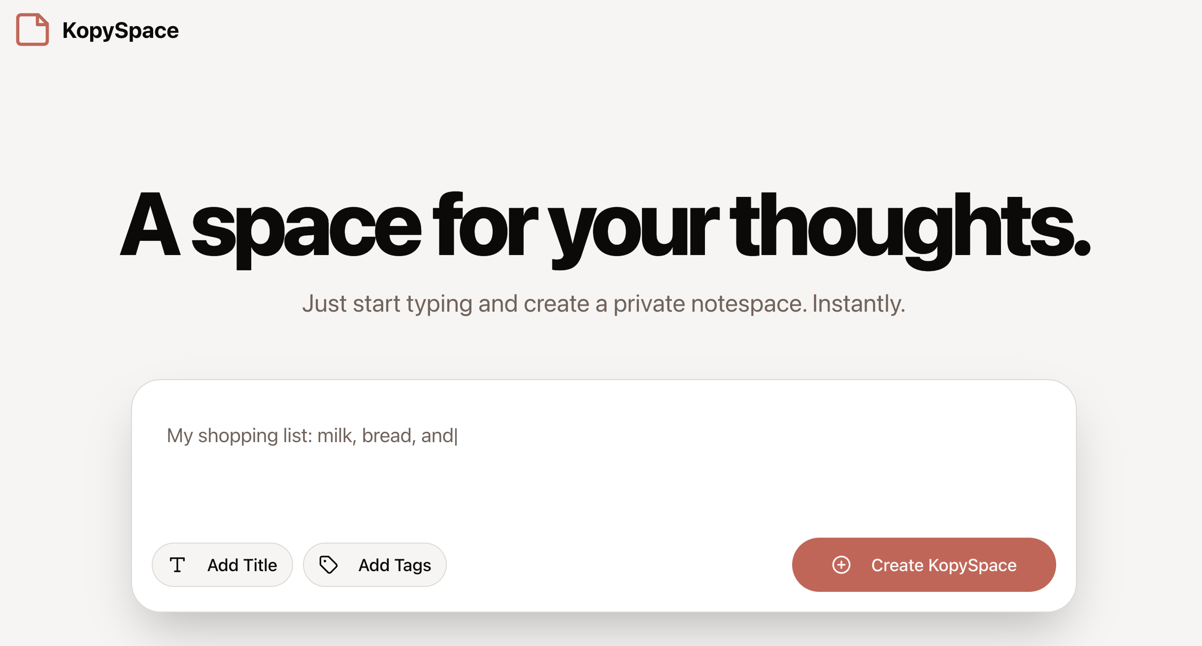 KopySpace是一款零注册的即时笔记应用,通过4字符URL快速保存笔记,支持可选密码和局域网共享,界面简洁无干扰。