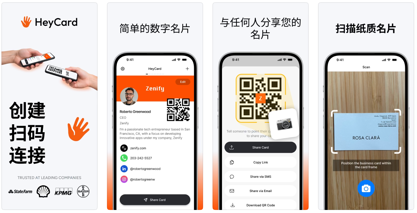 HeyCard是一款数字名片应用,允许用户创建无限制的自定义电子名片,并提供扫描纸质名片的功能。