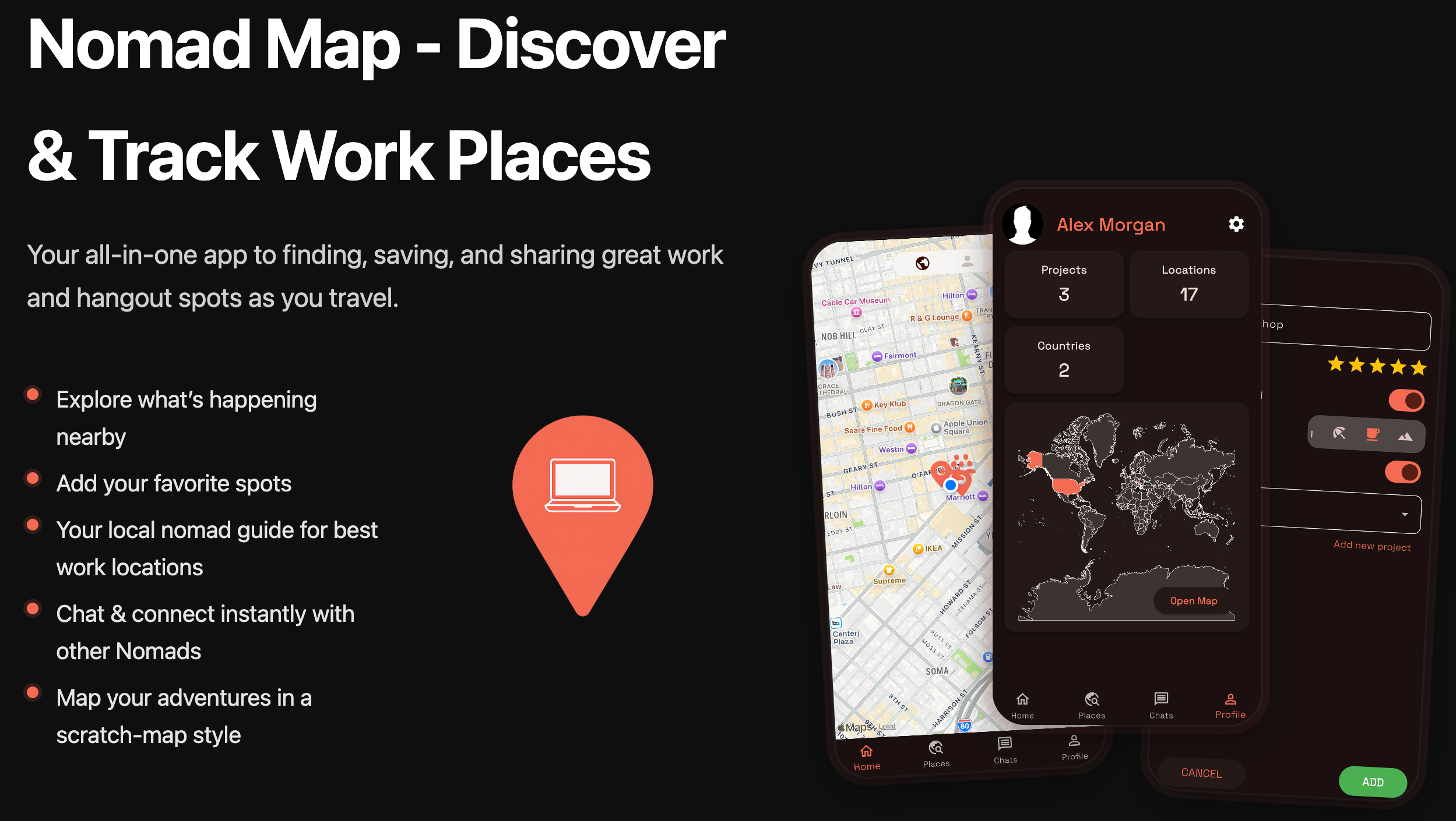 Nomad Map是一款为数字游民和创始人设计的应用,帮助用户发现适合工作的地点、记录工作足迹,并与其他游民连接。