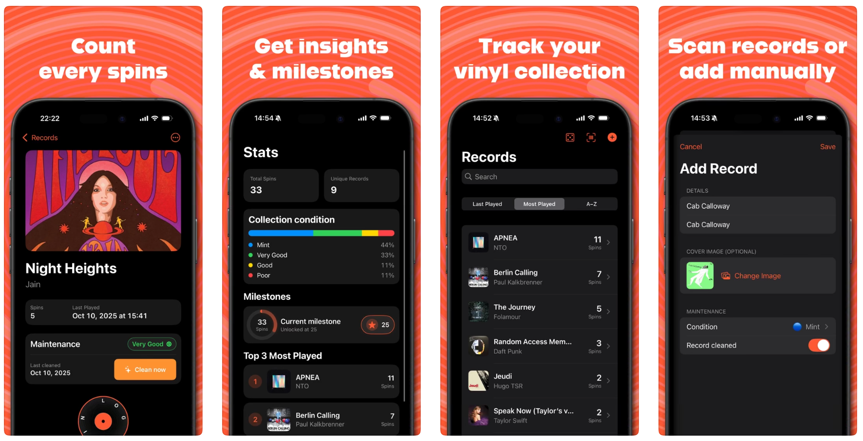 VinylSpinner是一款iOS应用,离线追踪黑胶唱片收藏及播放次数,用户可以方便地管理自己的唱片。