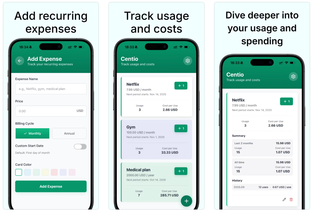 Centio是一款订阅管理应用,记录服务使用频率并计算每次使用成本,帮助用户评估订阅服务的价值。