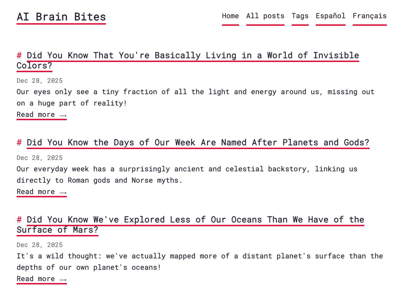 AI Brain Bites是一款趣味教育网站,使用AI自动生成涵盖科学、历史、自然和常识的短小知识,让学习变得有趣且轻松。