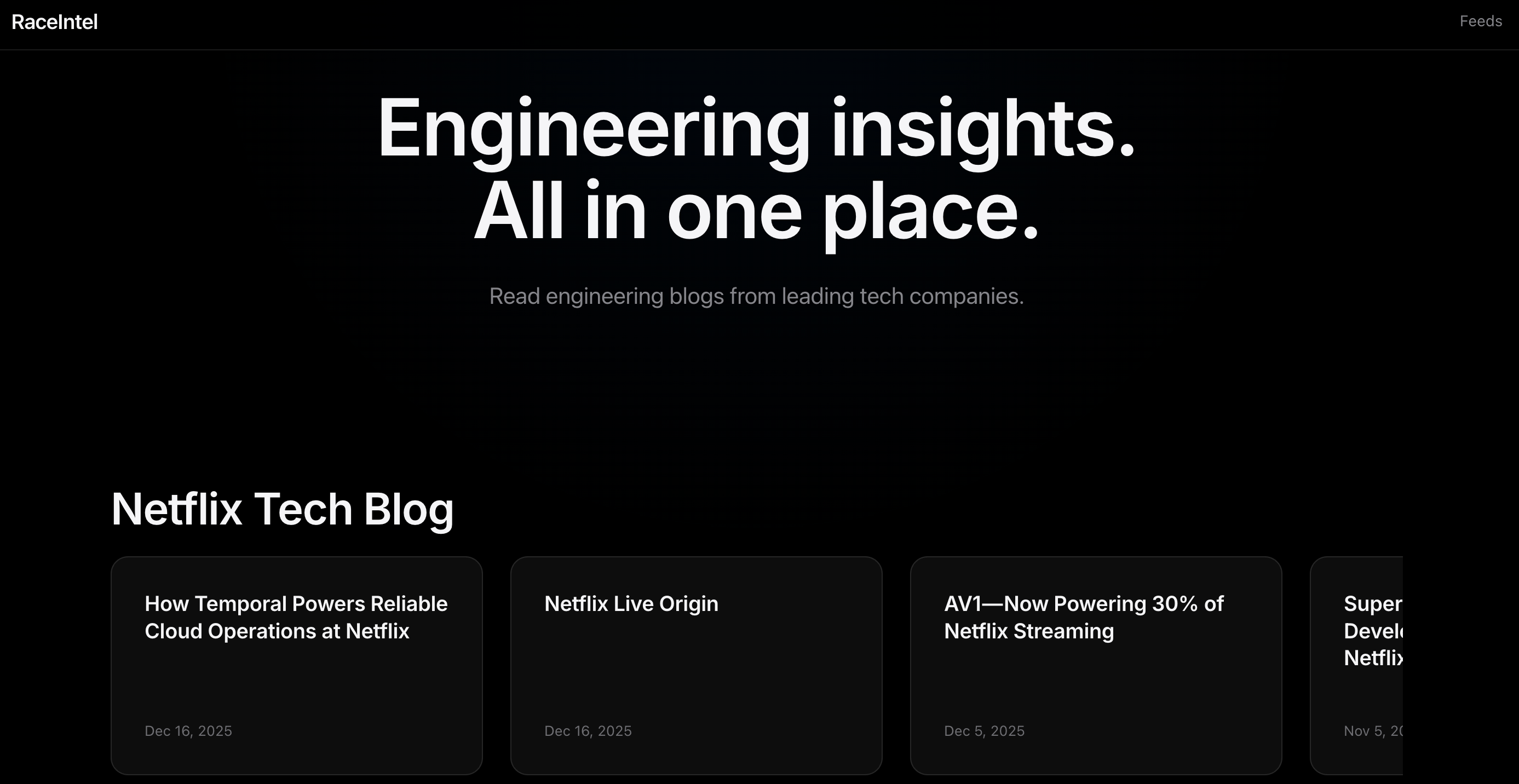 RaceIntel是一个聚合工程博客的网站,集中展示来自 Netflix、Google、Meta 等10家公司的最新技术文章,方便用户一次性获取多家公司的知识分享。