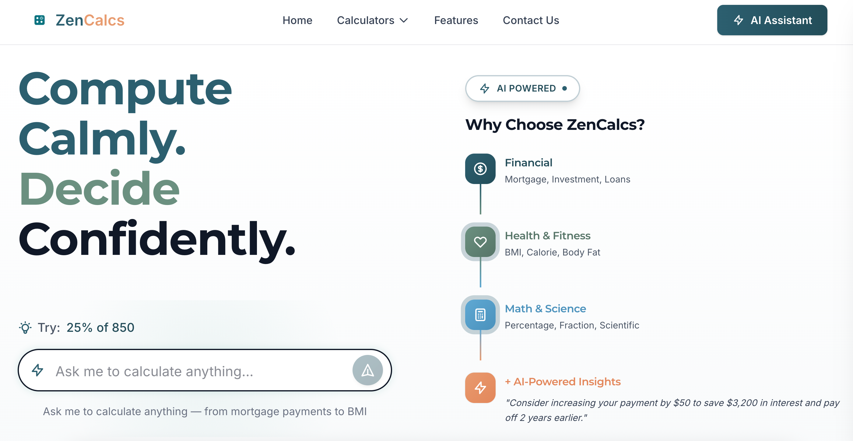 ZenCalcs是一款复利计算器应用,能够计算投资增长、提供可视化增长图表,并计划加入AI聊天助手功能以解答用户的财务问题。