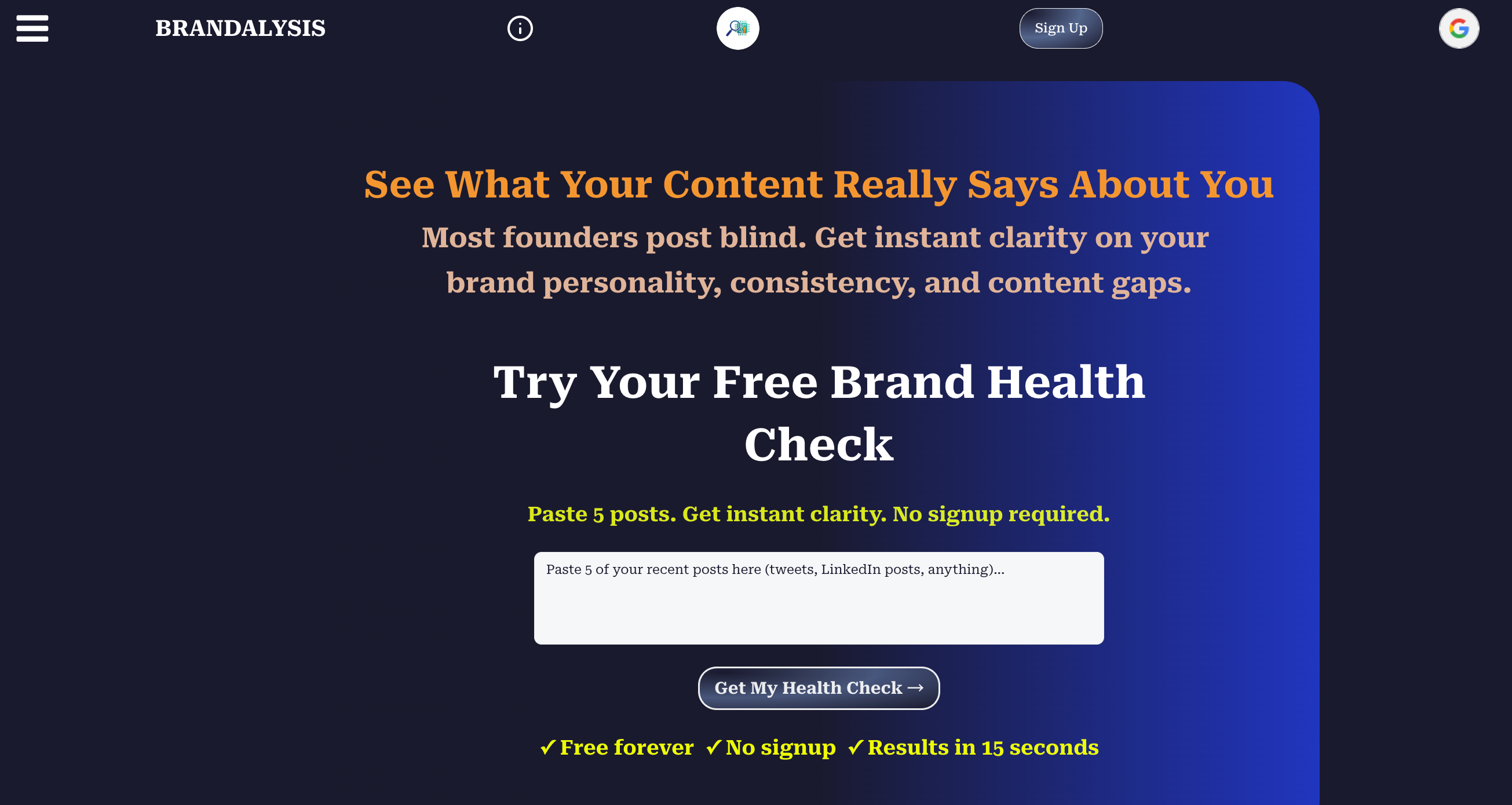 Brandalysis是一款个人品牌分析工具,通过分析社交媒体帖子,提供品牌个性、内容差距和定制帖子创意等即时分析。