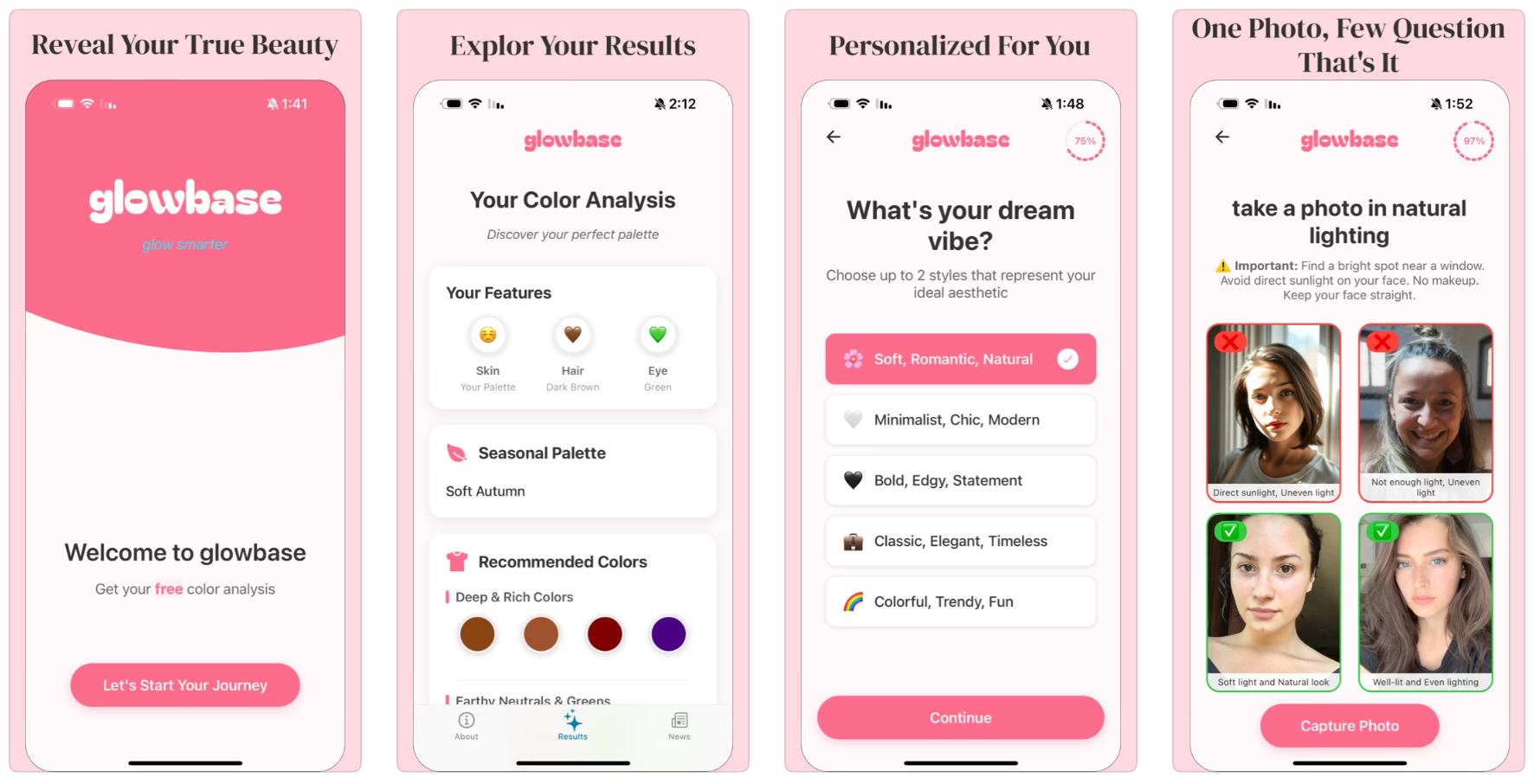 GlowBase是一款免费无广告的肤色分析应用,提供穿搭、妆容和首饰建议,旨在为用户提供个性化的颜色选择。