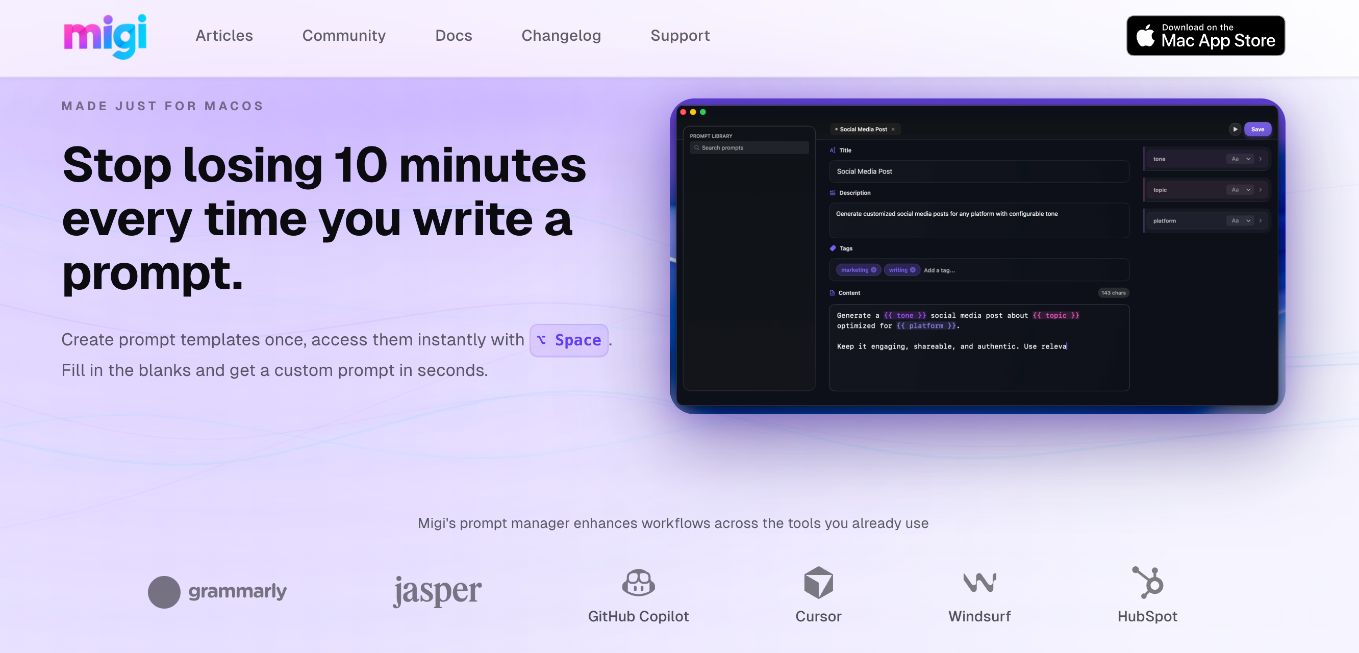 migi是一款MacOS软件,使用Swift和TDD开发,旨在管理提示和代码片段,开发者希望通过TestFlight收集用户反馈。