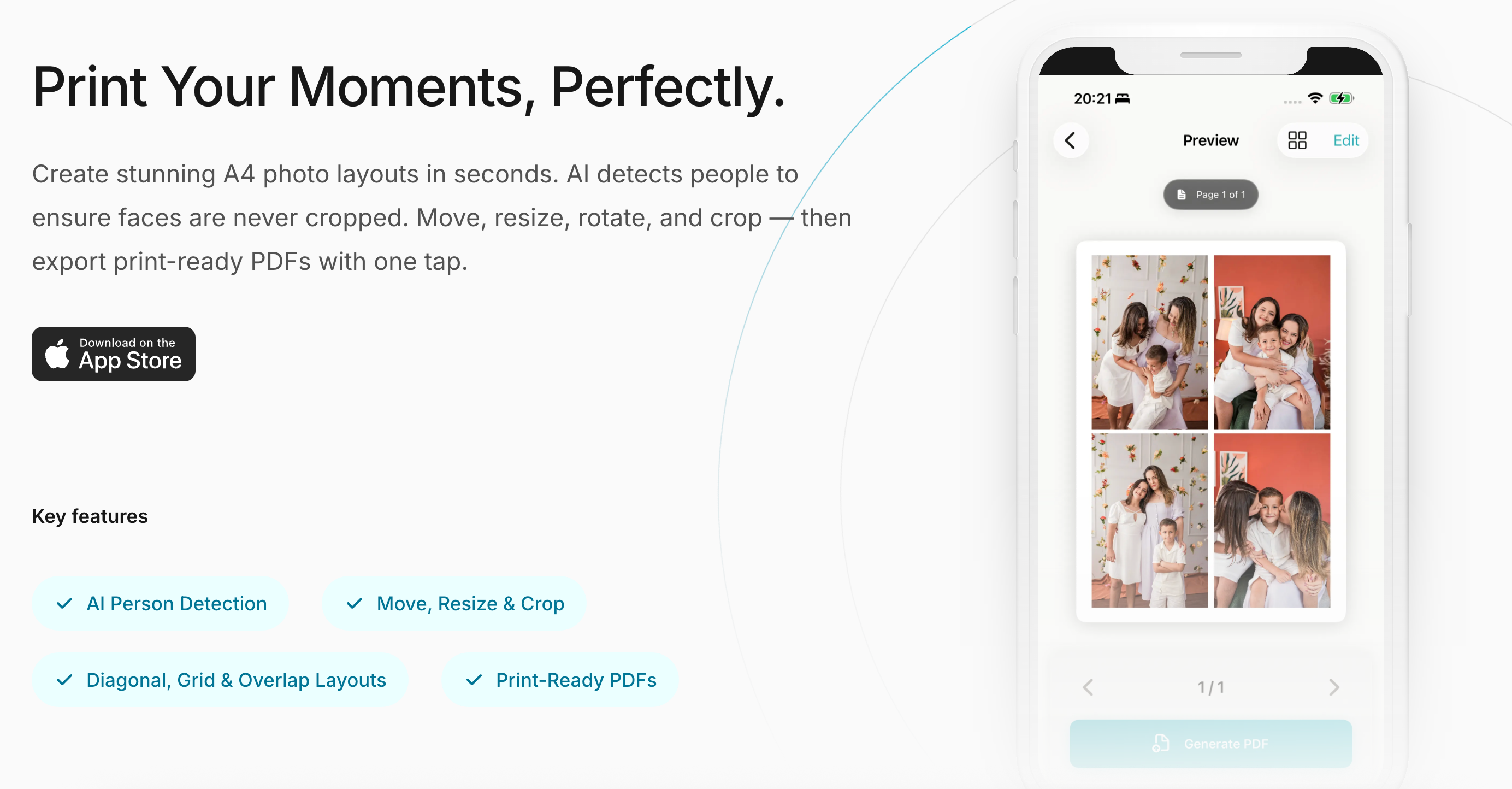 Printora是一款iOS应用,用于创建可打印的照片布局,支持人脸检测、智能分页、A4优化布局及完整的照片编辑功能。