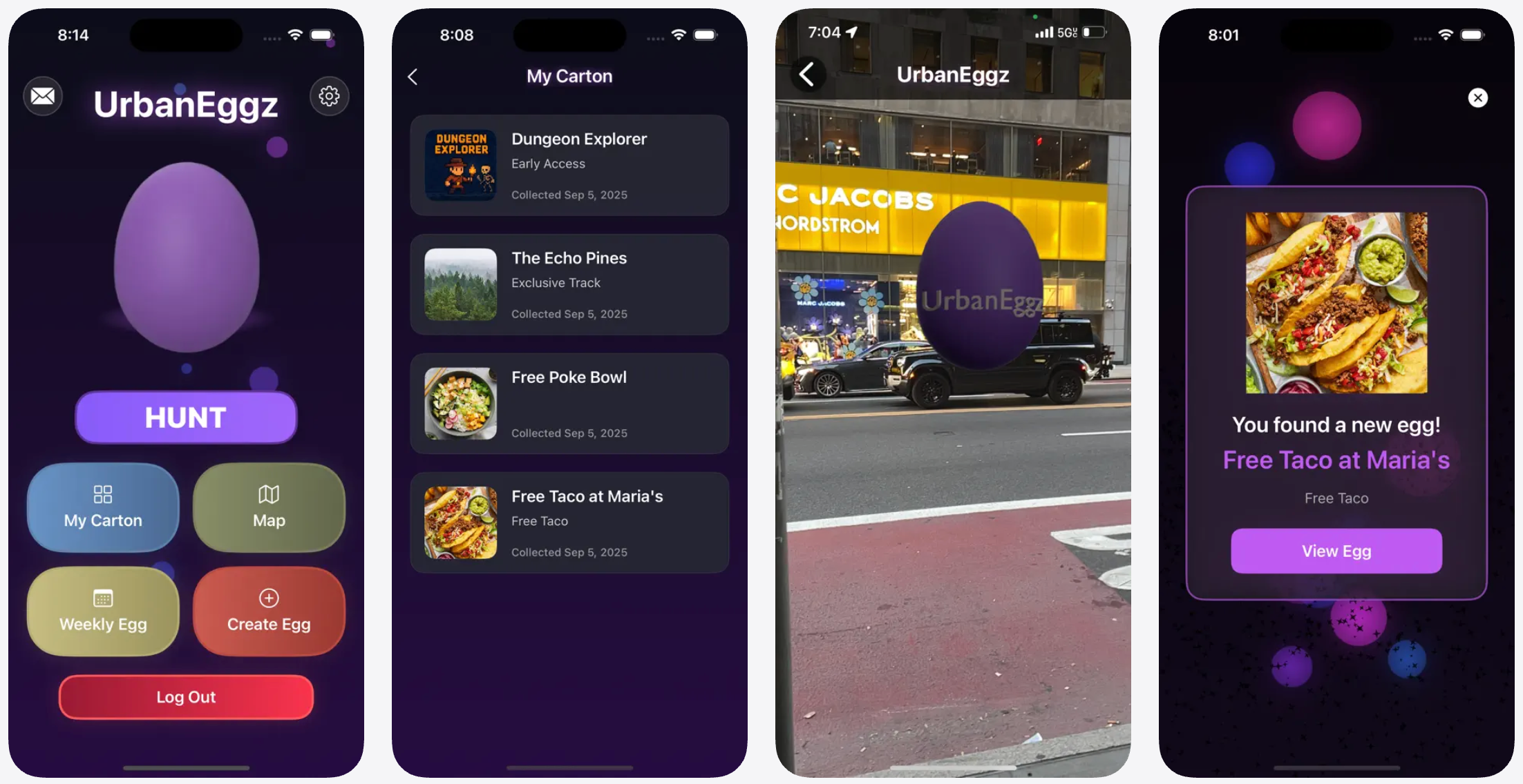 Urbaneggz是一款AR应用,允许创作者在现实世界中隐藏数字惊喜,收集者通过手机寻找这些惊喜。