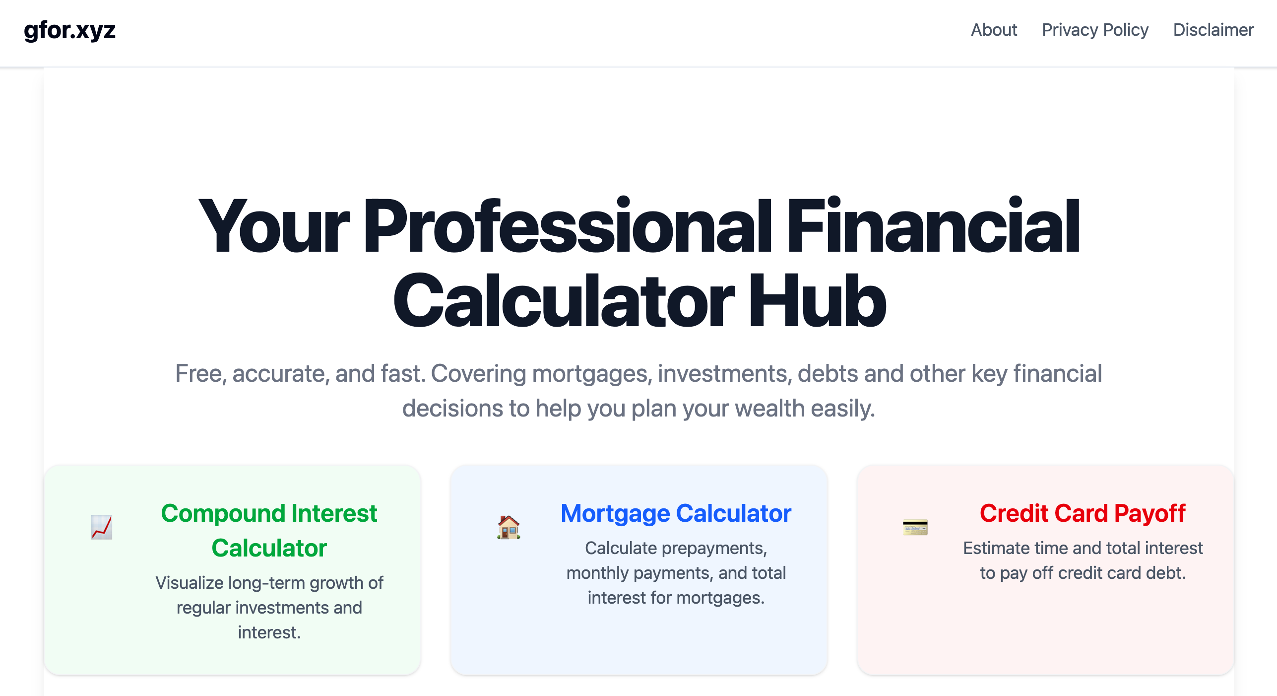 gfor是一款注重隐私的金融工具,提供多种实用的金融计算器,如房贷、租房与买房对比、FIRE/退休规划和ROI工具,无需注册,用户数据不离开设备。