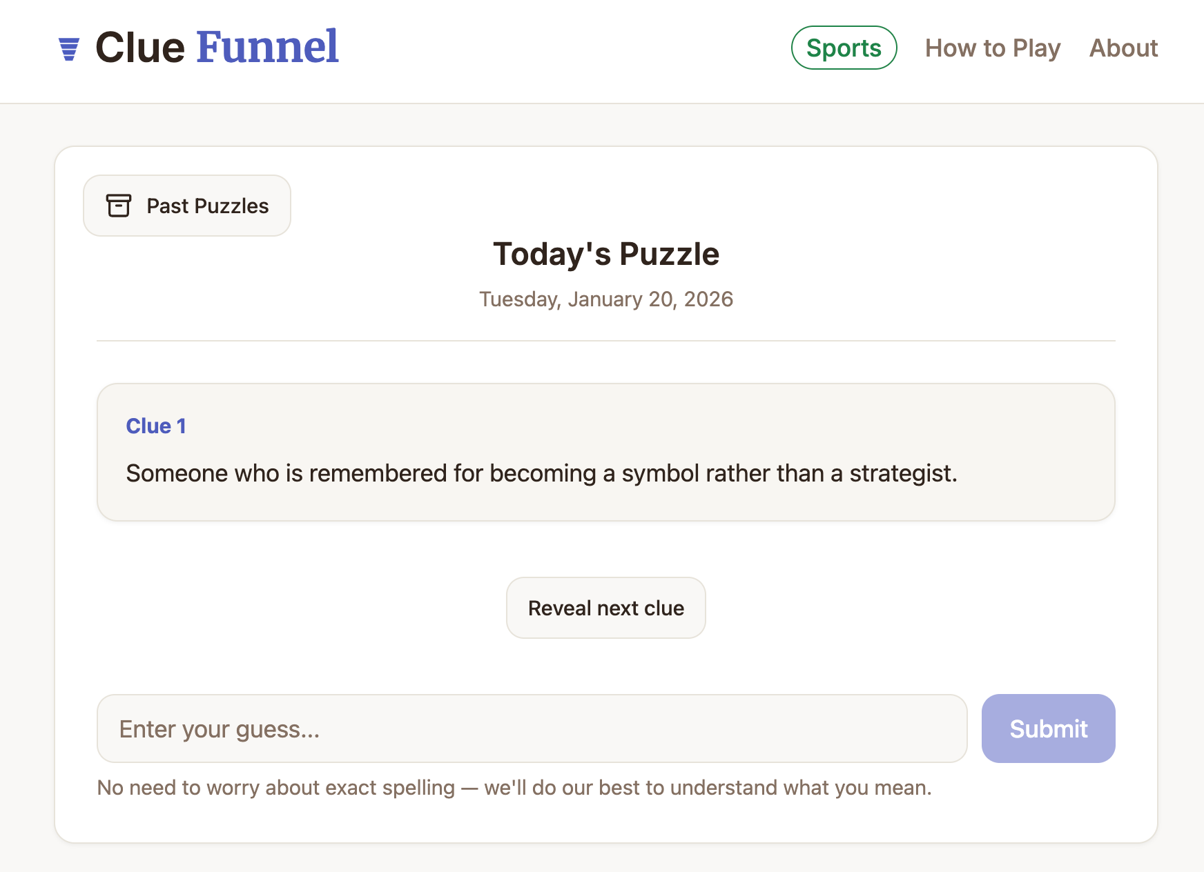 Clue Funnel是一款每日猜谜游戏,玩家通过6条从模糊到明显的线索来猜测神秘人物、地点或作品,每局耗时30-60秒。