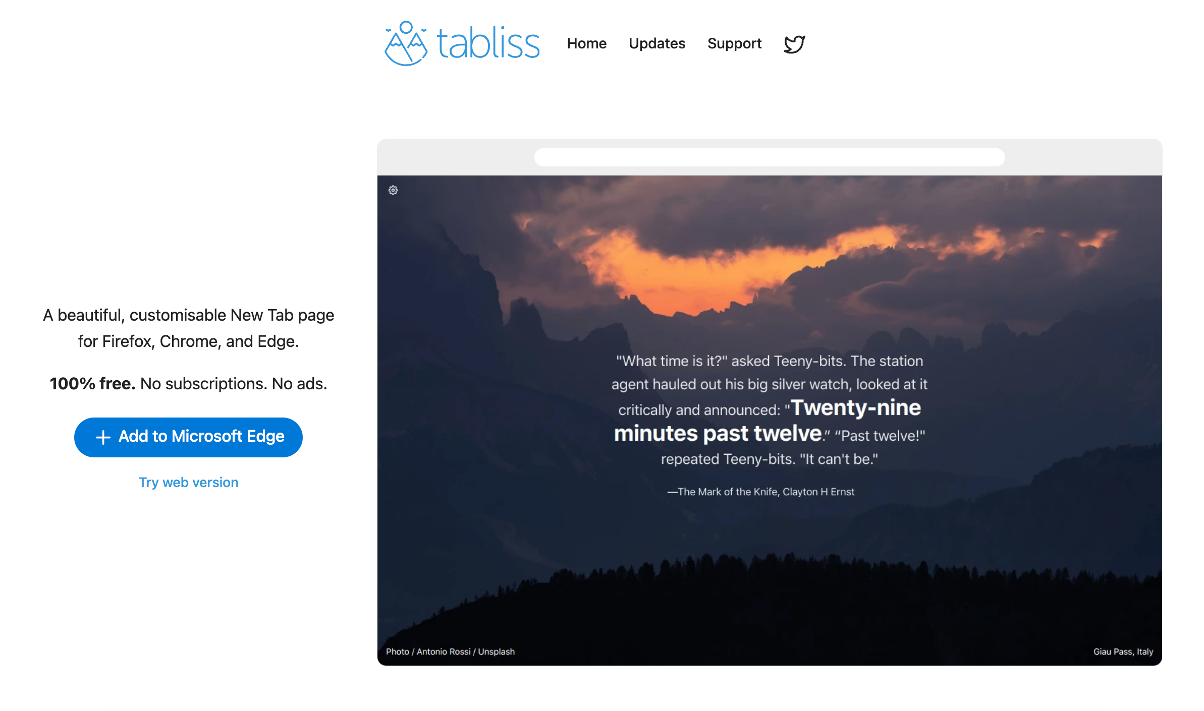 Tabliss是一款美观、方便、稳定的开源起始页插件,适用于Chrome、Firefox和Edge浏览器,无需任何权限。
