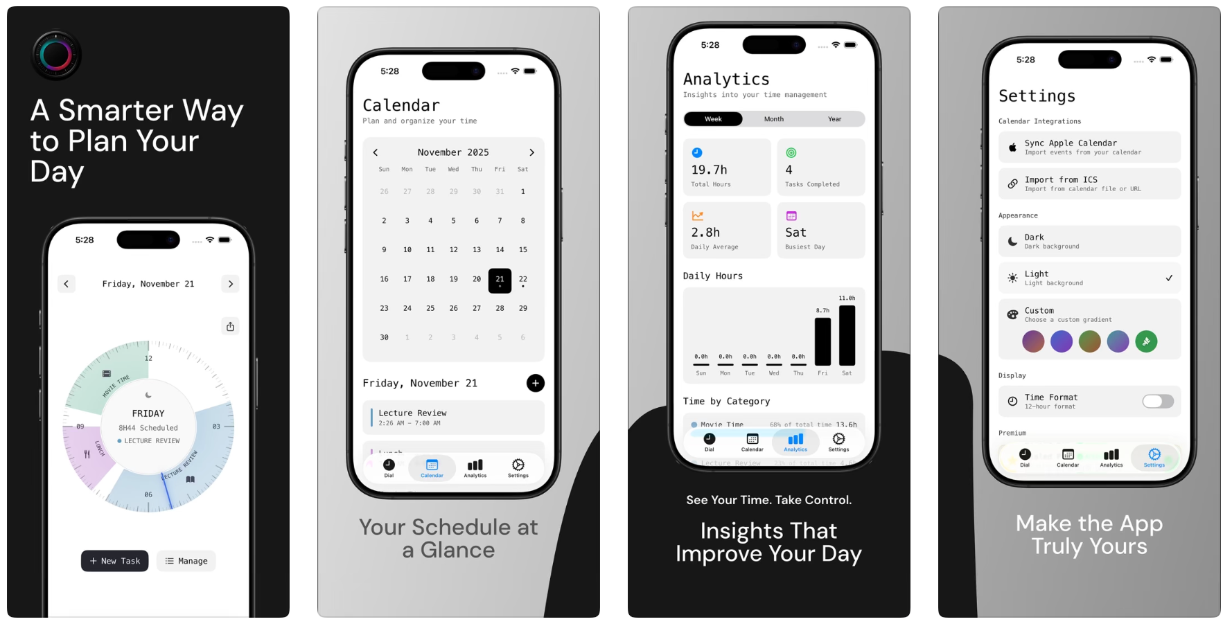 Dialed是一款径向时钟应用,可视化日程、Apple Calendar同步、自定义主题和分析功能。