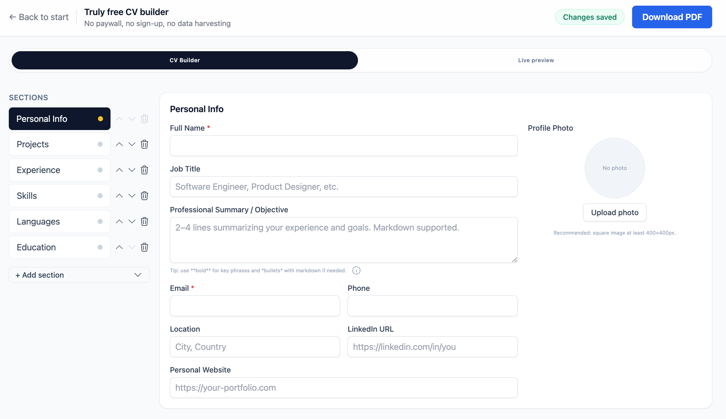 buildmyfree是一款免费简历生成器,无需注册、无广告、无追踪,所有操作在本地浏览器运行。