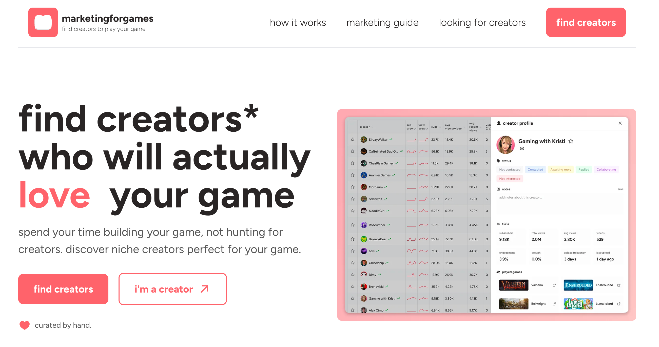 marketingforgames是一款免费的工具,帮助独立游戏开发者根据观看和互动指标,寻找合适的YouTube游戏内容创作者。