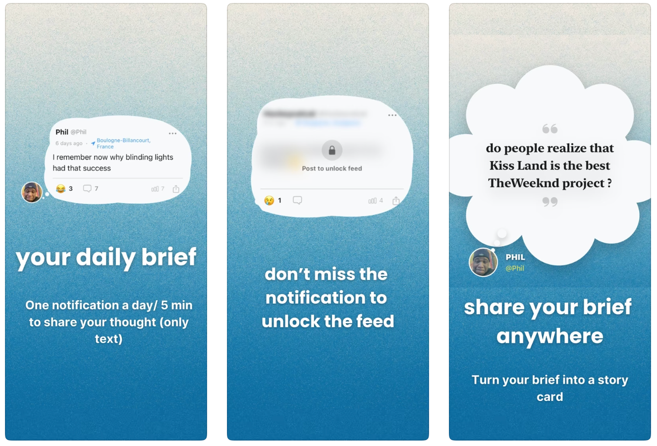 Brief是一款iOS社交应用,每天通过一次随机通知提醒用户,限时5分钟发布文本内容,发布后解锁好友动态24小时,旨在创造更真实的社交体验。
