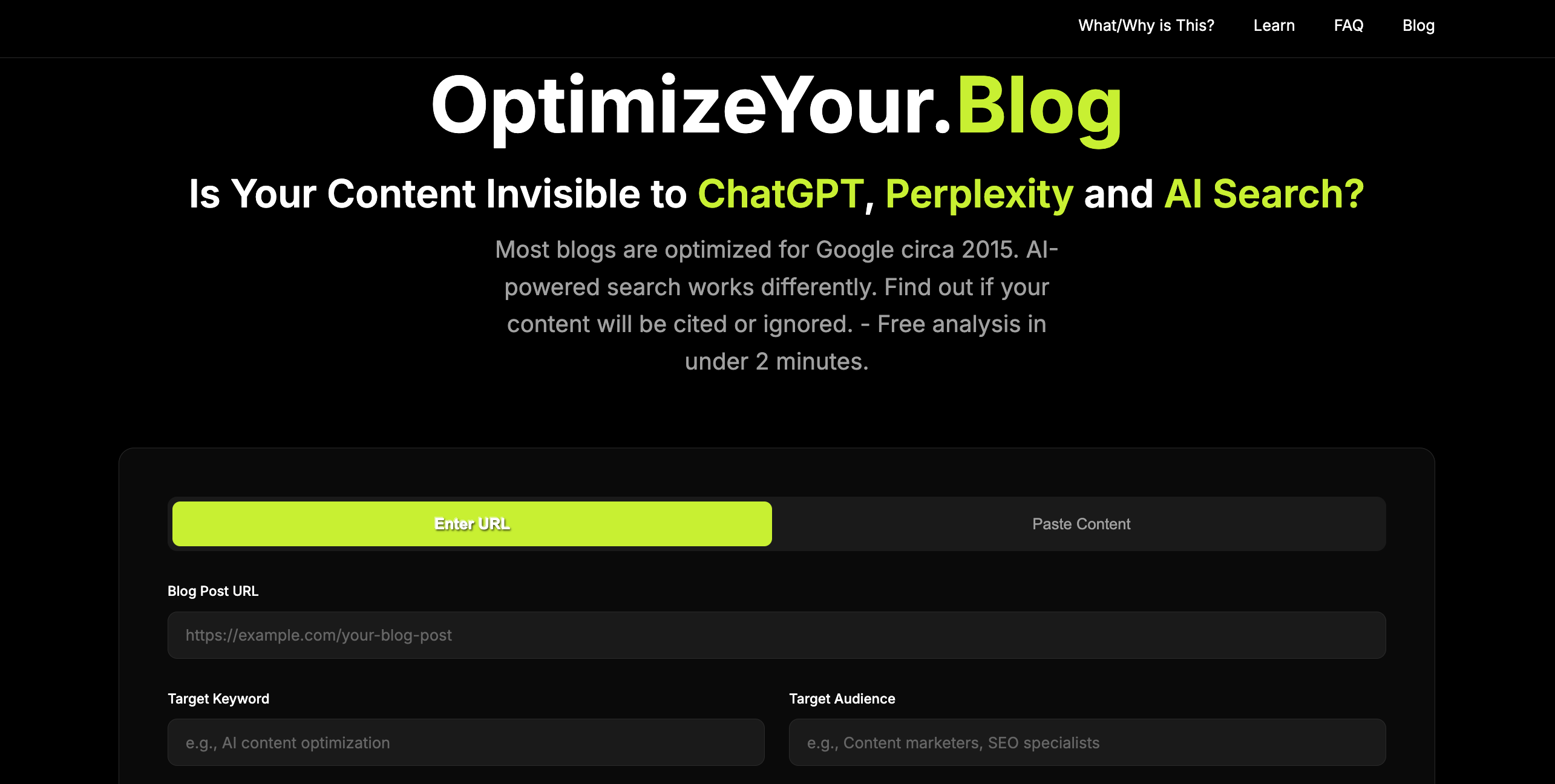 Optimizeyour是一款AI搜索优化工具,分析内容的AI可发现性、引用价值和结构化数据,弥补传统SEO工具的不足。