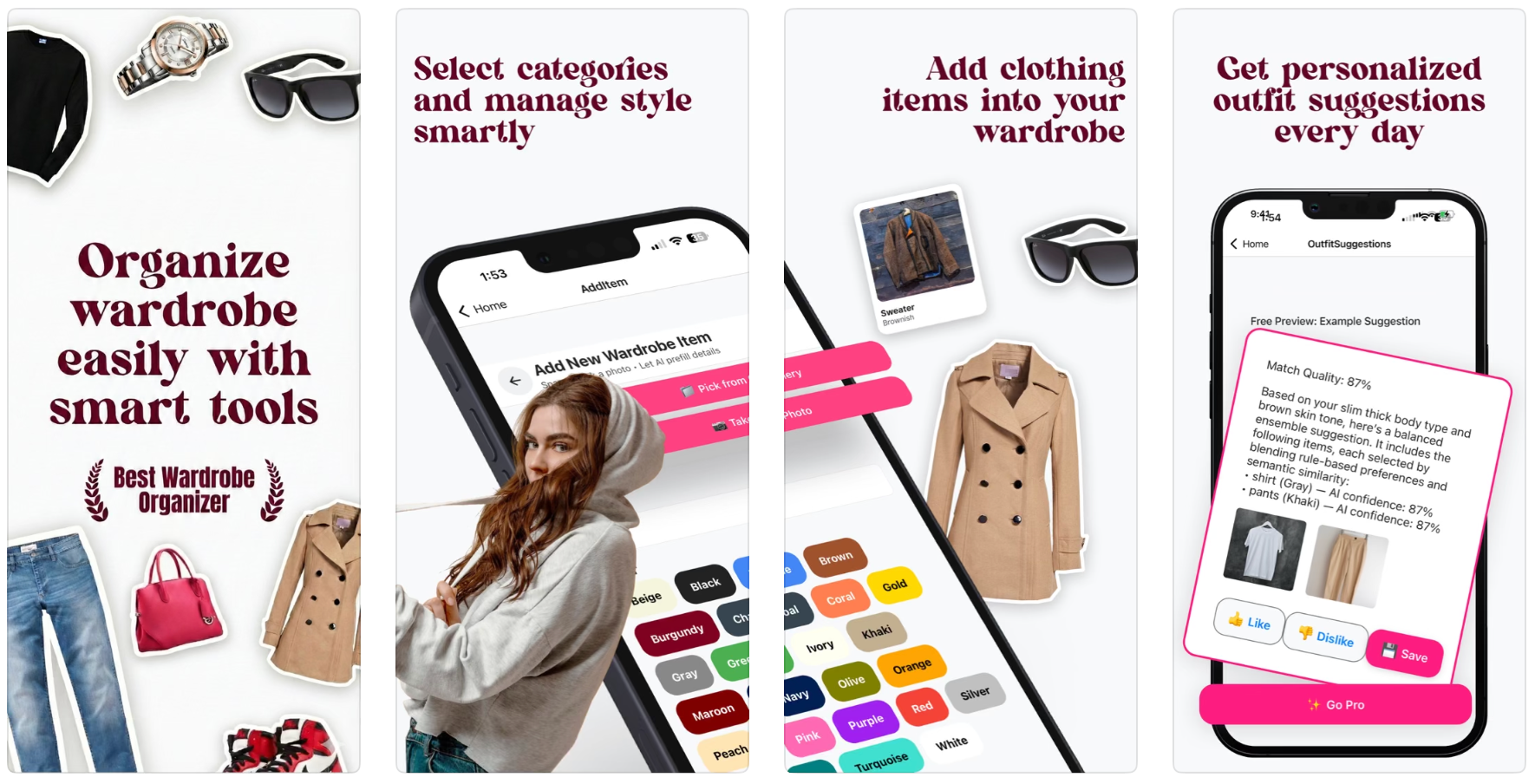 Wardrobe Savvy是一款AI衣橱助手,通过上传衣物照片自动识别类别与颜色,并根据体型、肤色、场合和天气提供个性化搭配建议。