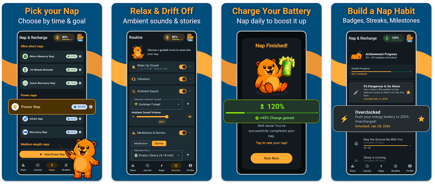 Nap & Recharge是一款Android应用,通过动态电池机制代替传统计数器,帮助用户通过科学小睡恢复能量,并新增本地化语言、桌面小部件和自动备份功能。