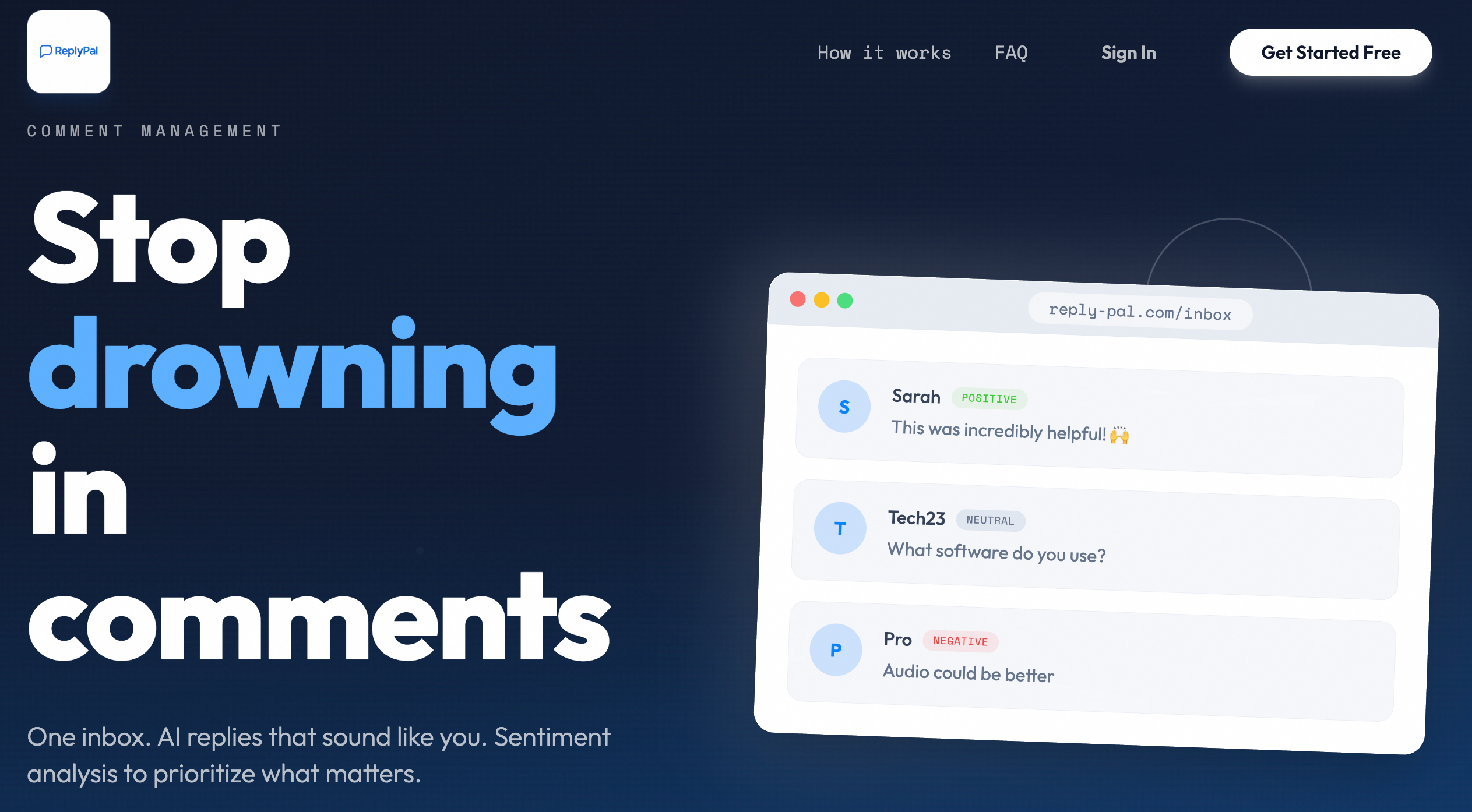 ReplyPal是一款YouTube评论管理SaaS,提供统一收件箱、AI回复、自动翻译、情感分析与自动审核等功能。