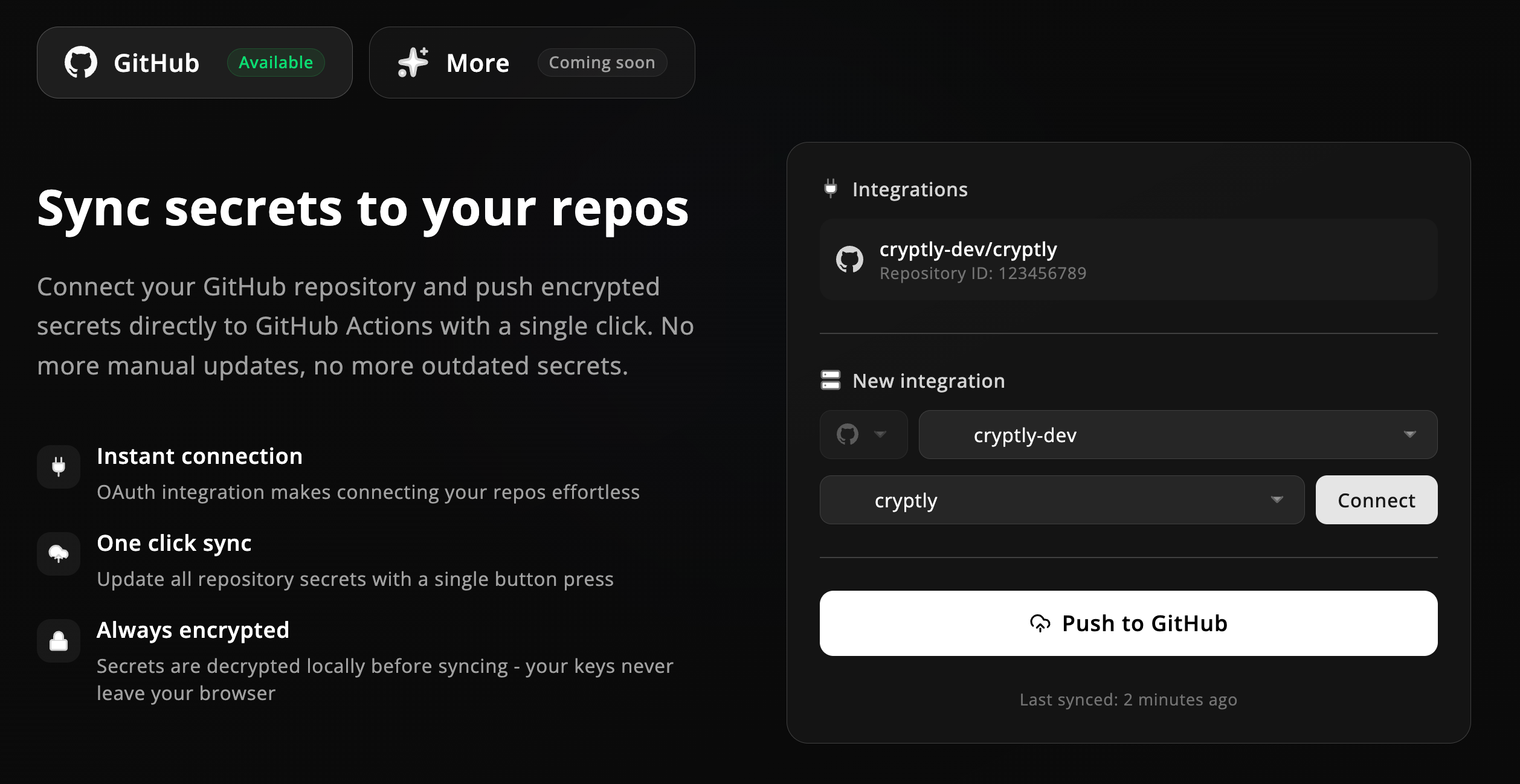 cryptly是一个免费开源的 secrets/.env 编辑器,端到端加密、协作功能、版本历史和 GitHub Secrets 集成,确保敏感信息安全管理。