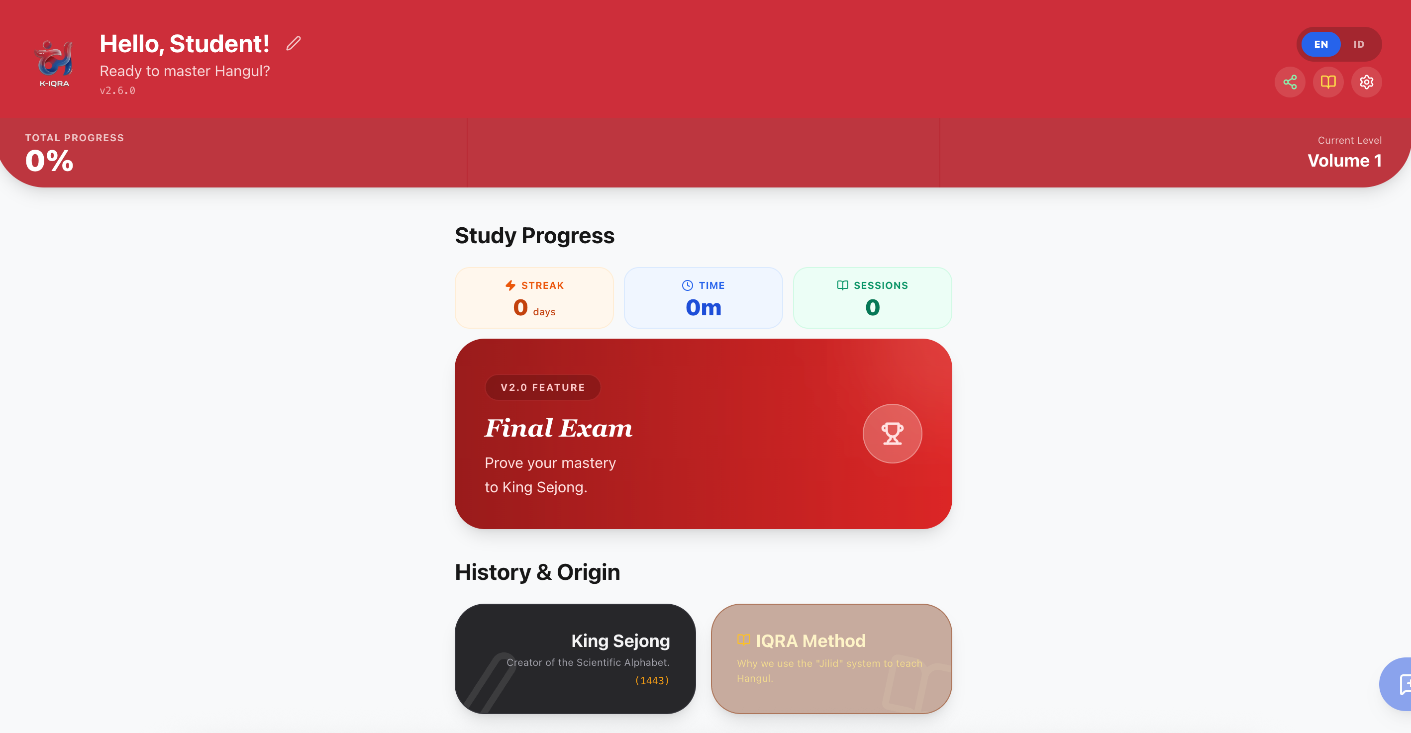 K-IQRA是一款免费的韩语学习Web应用,采用IQRA方法逐步教授韩文,包含发音规则、笔画顺序、世宗大王历史,并提供最终Boss考试来检验掌握情况。