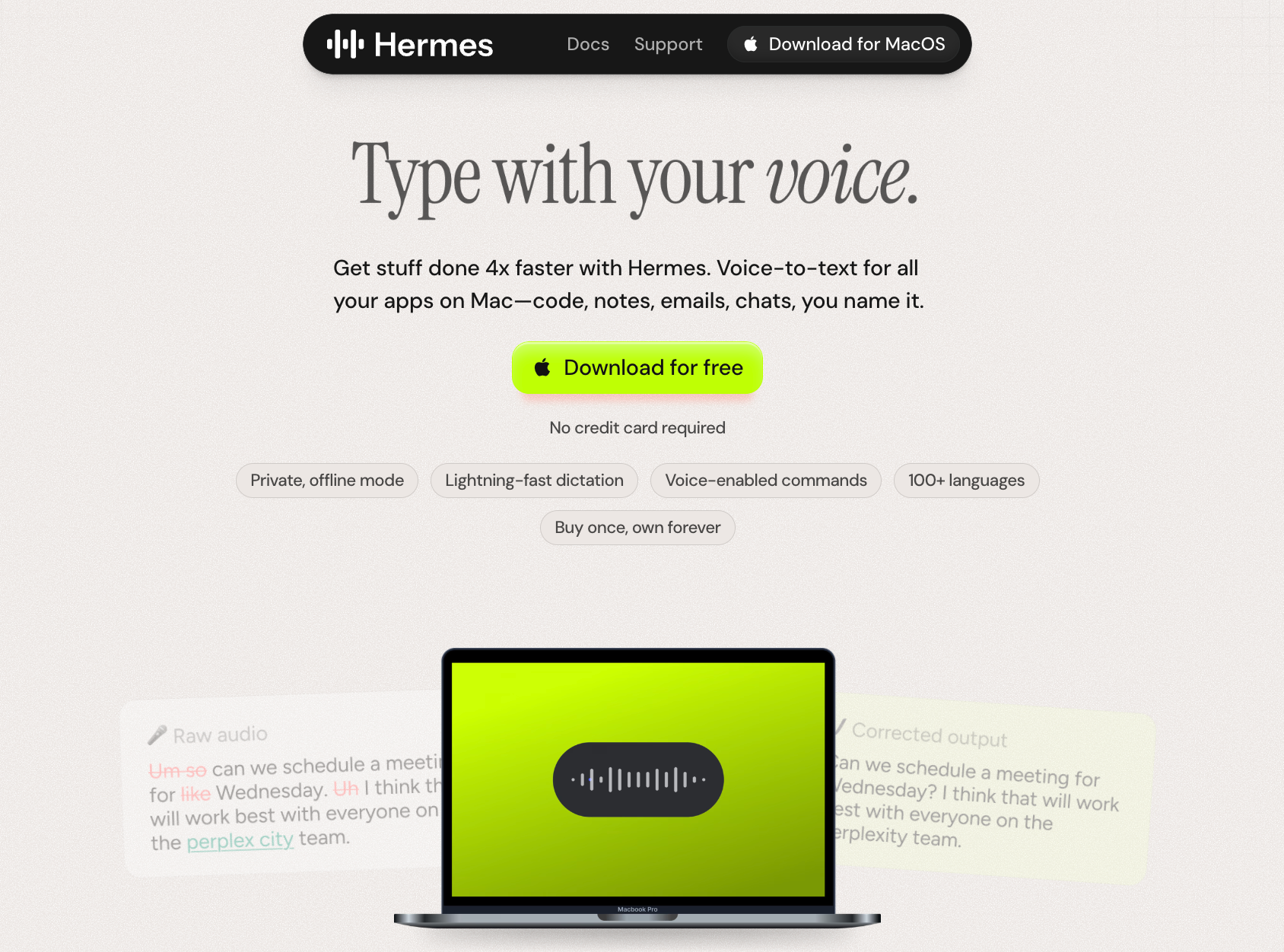 Hermes是一款Mac语音应用,快速语音转录、智能字典、语音控制、可移动的Hermes Bar以及深度语境支持,提供语音命令和AI编辑功能。