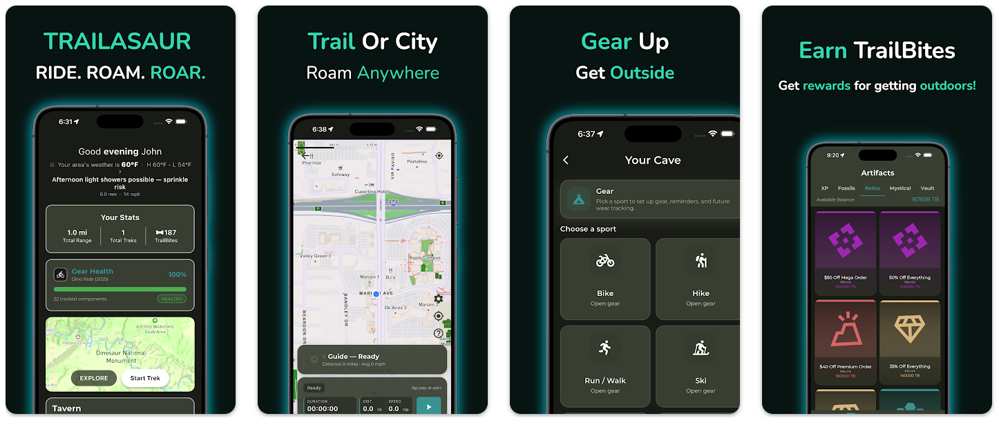 TRAILASAUR是一款户外运动追踪应用,将徒步、滑雪、跑步等活动转化为任务,追踪装备磨损与维护。