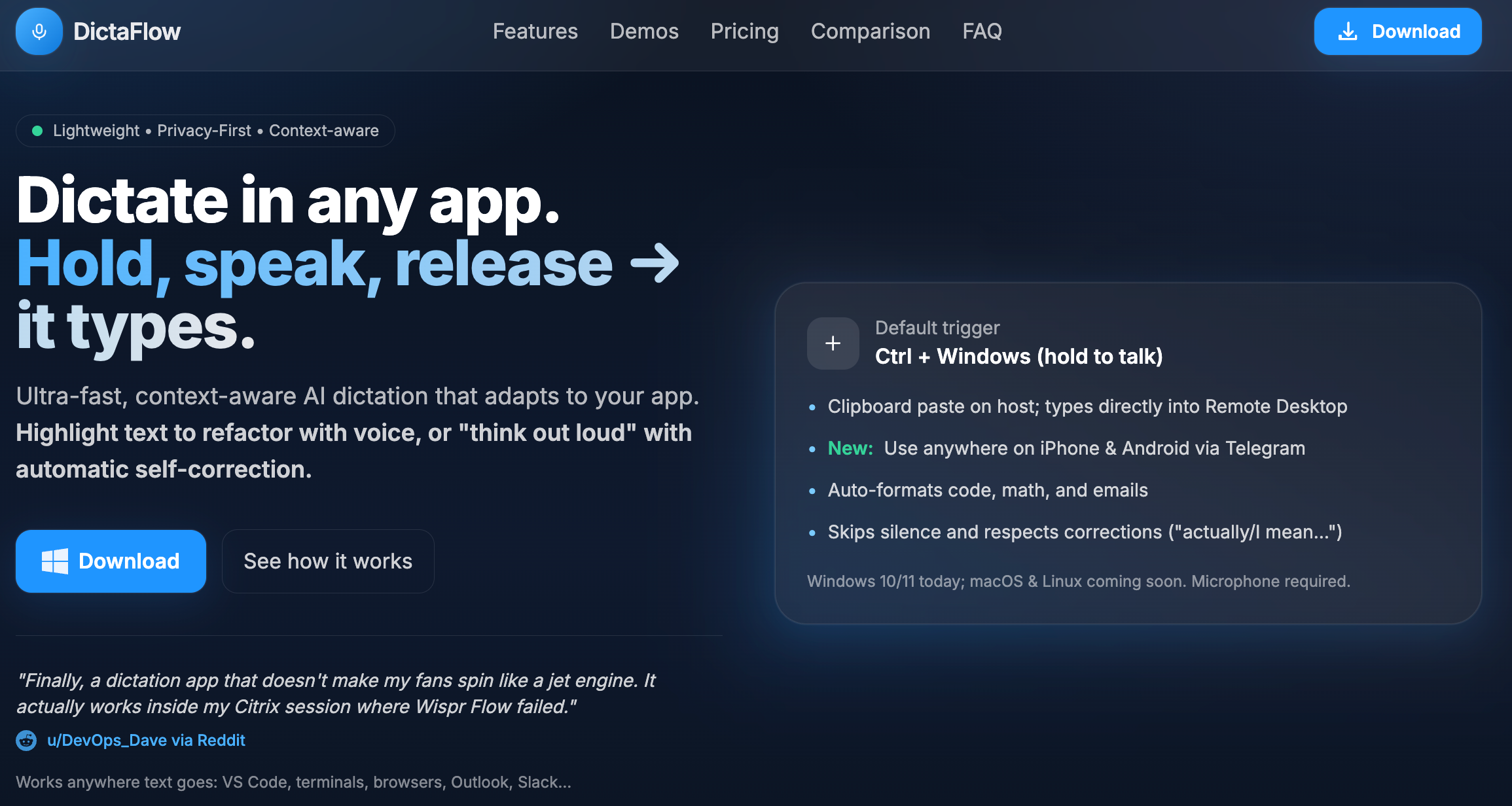 Dictaflow是一款Windows听写应用,按键说话后可以在任何应用程序中输入文本,解决了跨应用、键盘布局和远程桌面等技术难题。
