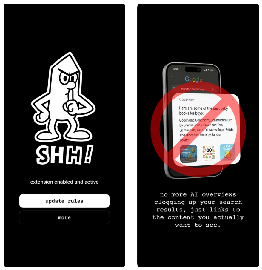 Shush! 是一款iOS应用,移除Google搜索结果中的AI Overviews,旨在提供更清洁的搜索体验,并计划扩展至更多网站,阻止AI元素干扰。